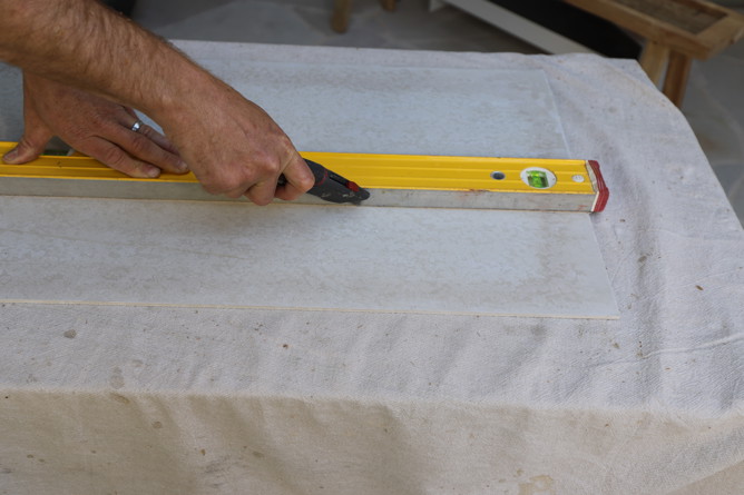 Step 4: Once you have dusted off the rebated section of the table, measure up for the fibro sheet. Using a Stanley knife you can simply score and snap the fibro
