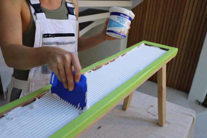 Step 9: Once the tiles are dry we can now grout. Stick down some masking tape around the edges of the rebated section to keep grout off the timber which will prevent any staining It’s a pretty easy process all you need to do is mix up your grout to a smooth non slumping paste and wipe into the gaps between tiles using a grouting trowel. Sponge off any excess grout with the clean water and peel off the tape