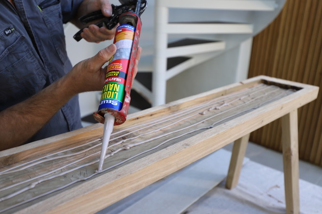 Step 5: Using Selleys Liquid Nails Heavy duty. Cut the cartridge tip screw on the nozel and cut the tip off the nozel. Then using the calking gun – Selleys make this . Apply beads of Liquid Nails Heavy Duty into the rebated area , make sure the beads are spaced 40cm apart. This is the best glue to use for this job as it Super fast drying and has excellent resistance to water and weather.