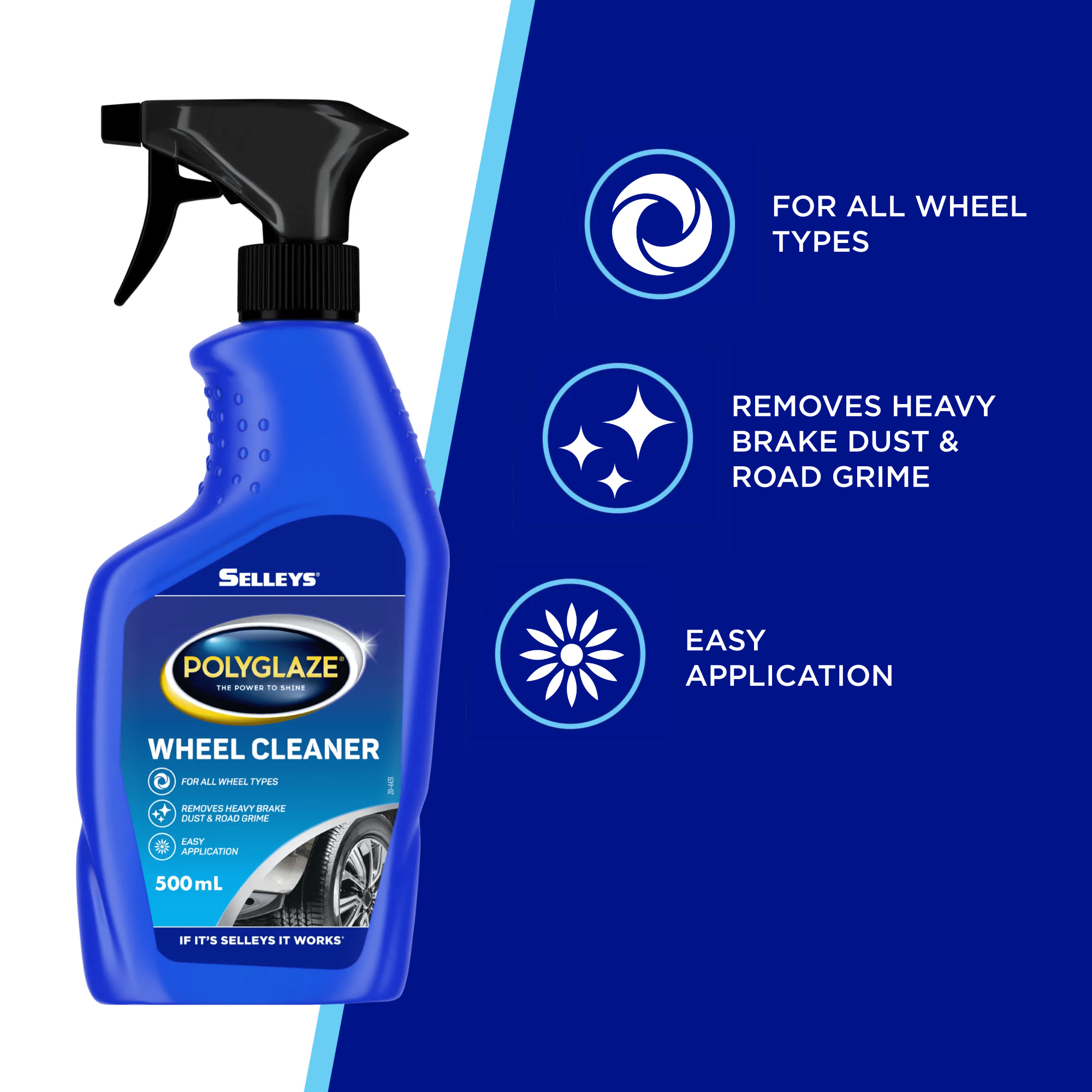 Selleys Polyglaze Wheel Cleaner is suitable for all wheel types and effortlessly removes brake dust, road grime and dirt from wheels. It is easy to apply: simply spray on, wipe and hose off.