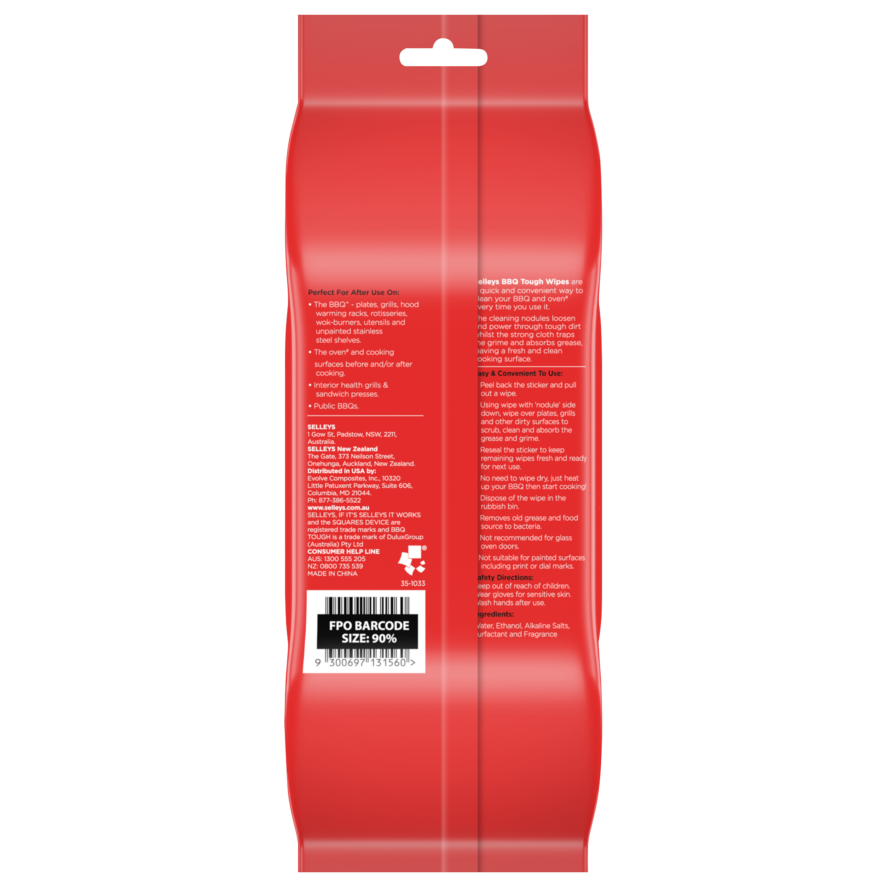 Selleys BBQ Tough Wipes are an effective, quick and convenient way to clean your BBQ every time you use it. They are perfect for BBQ surfaces and the powerful cleaning nodules loosen and power through tough dirt while the strong cloth traps the grime and absorbs grease leaving a fresh, clean and healthier cooking surface.