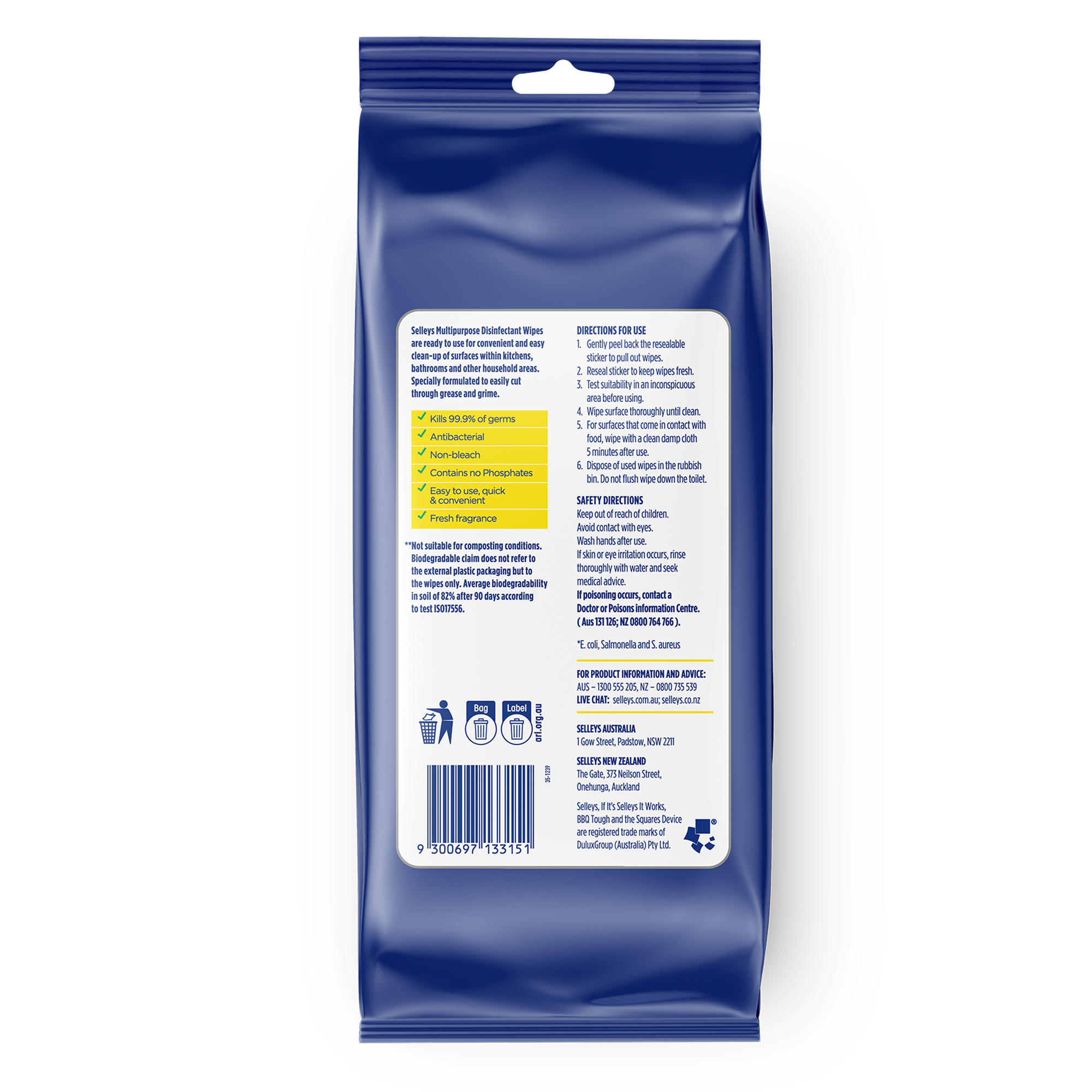 Selleys Multipurpose Disinfectant Wipes are ready to use for convenient and easy clean-up of surfaces within kitchens, bathrooms and other household areas. Specially formulated to easily cut through grease and grime.