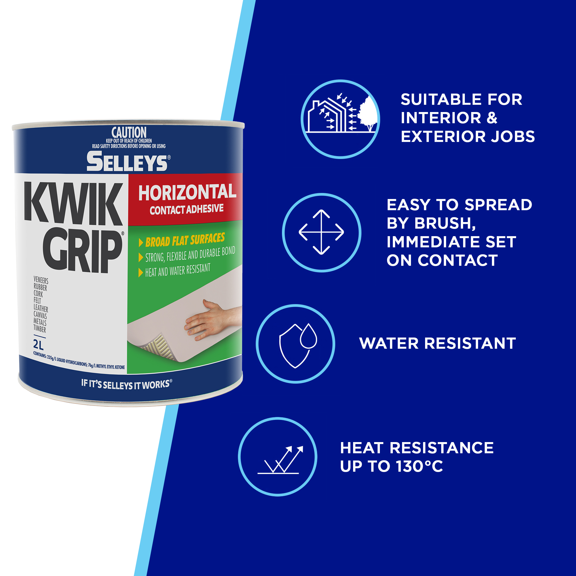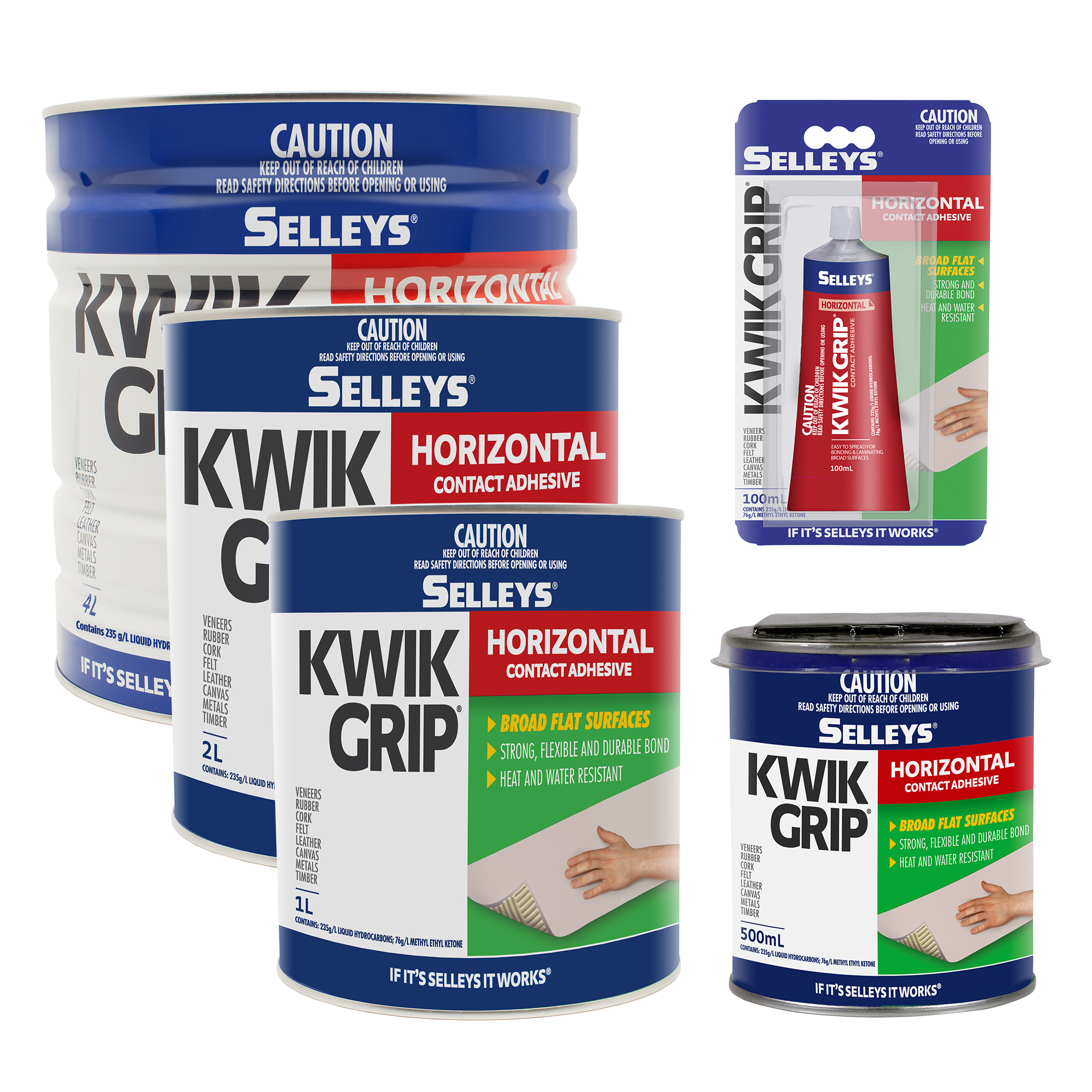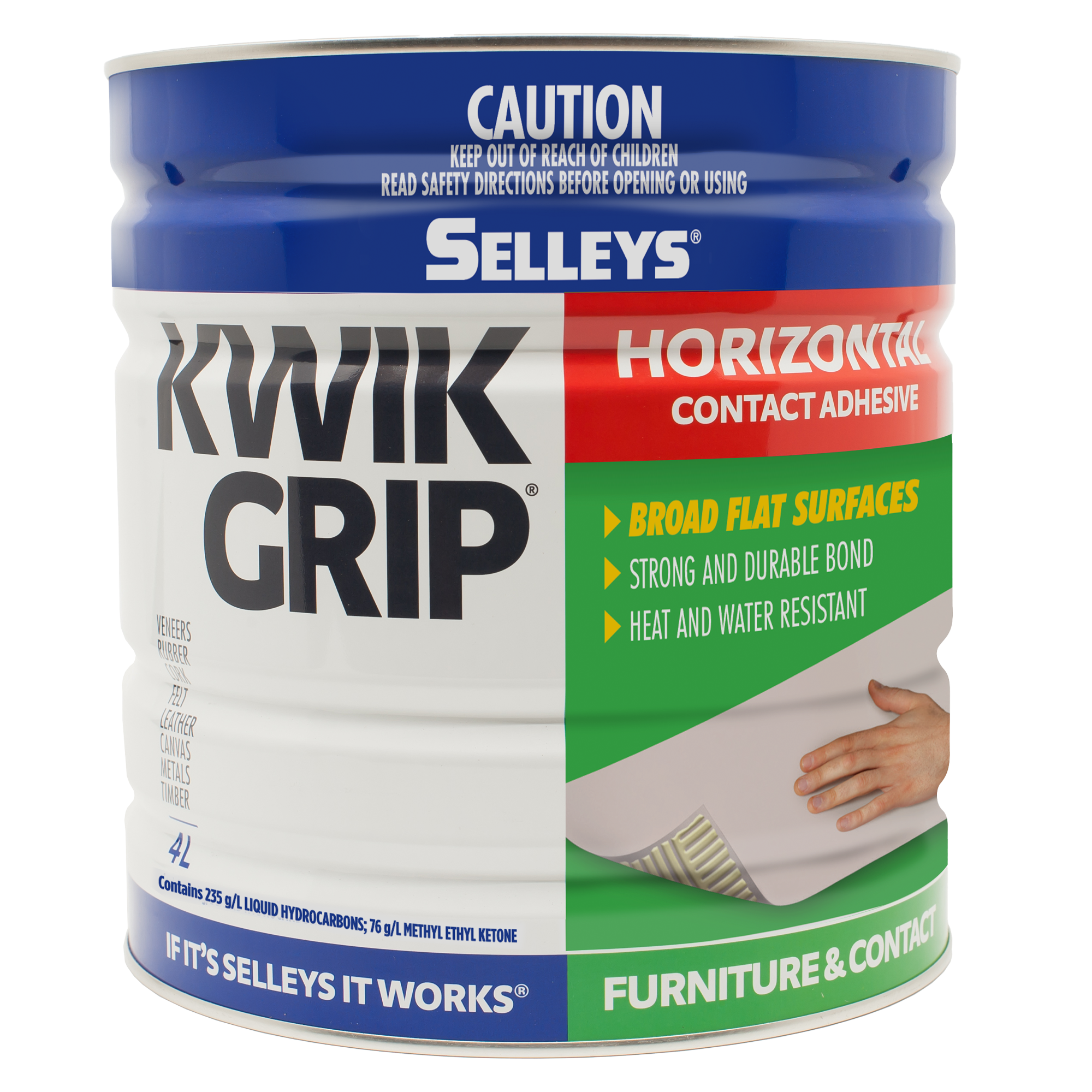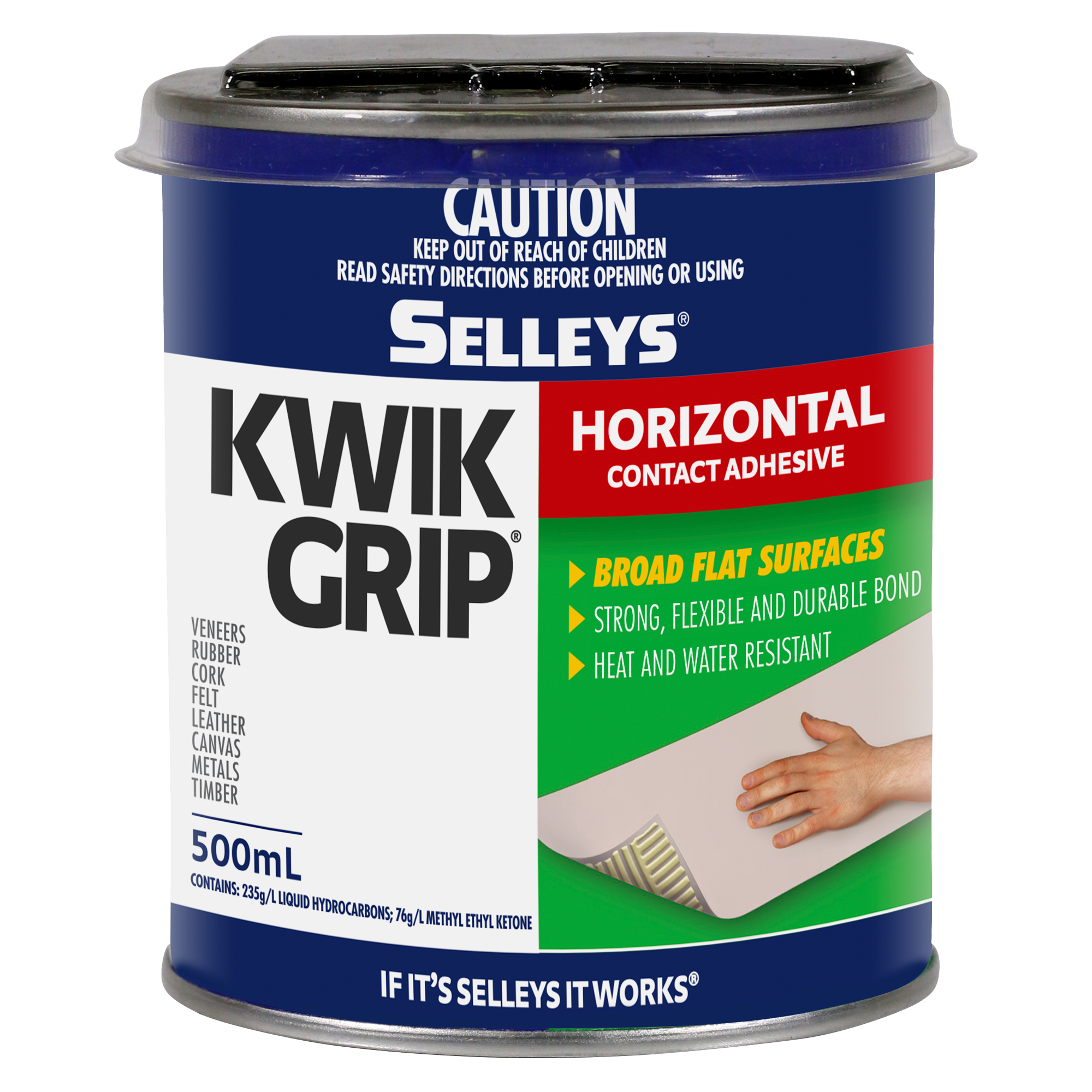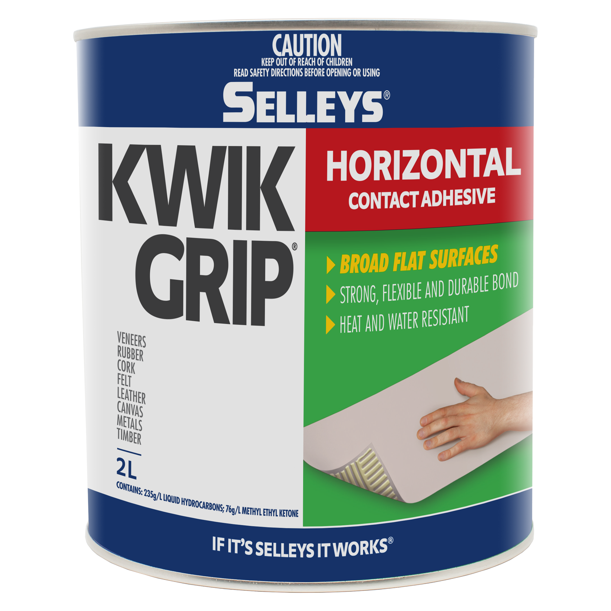 Selleys Kwik Grip® Horizontal is a heat resistant, solvent-based, flexible contact adhesive that forms an instant bond on contact of two surfaces.