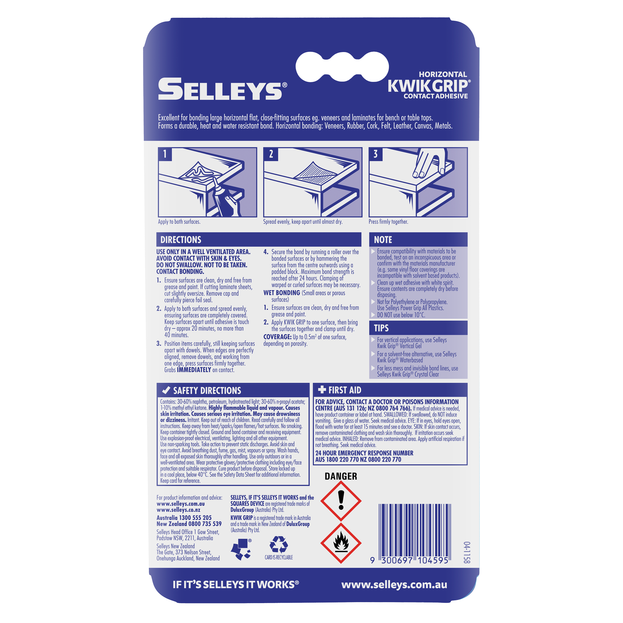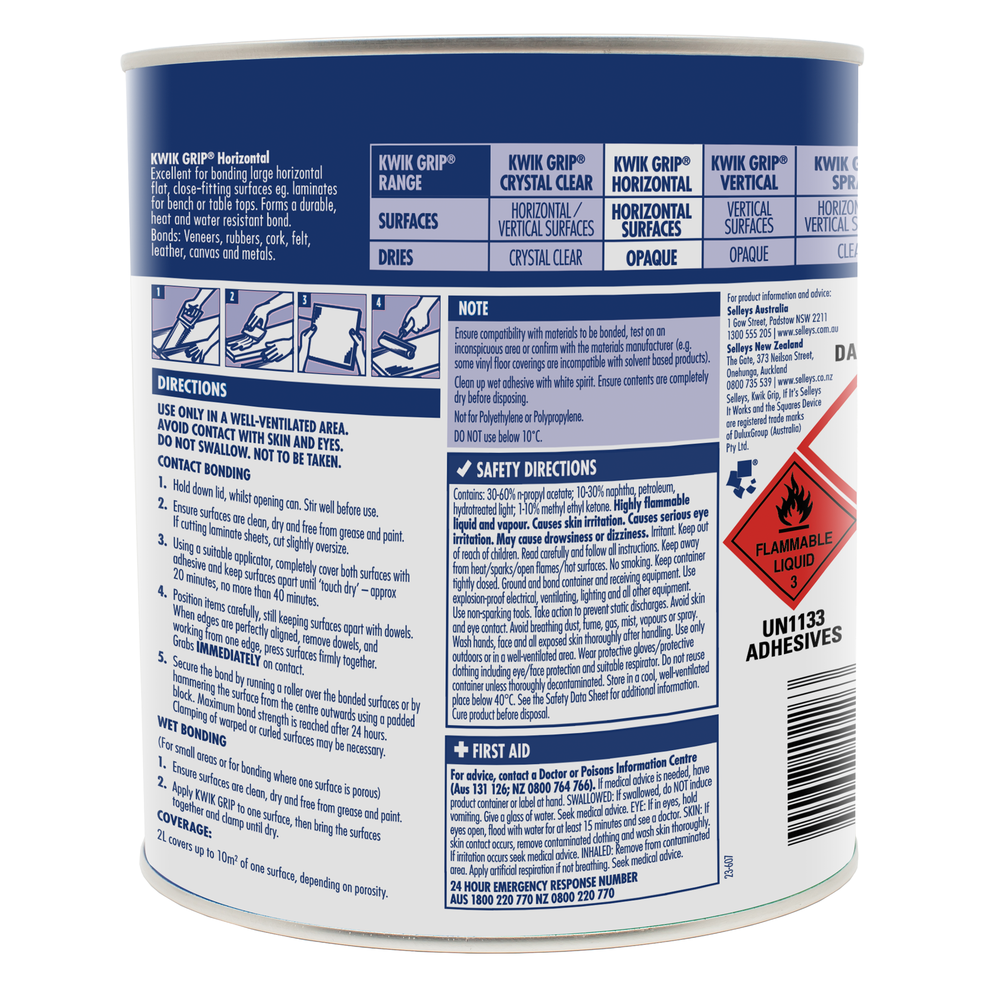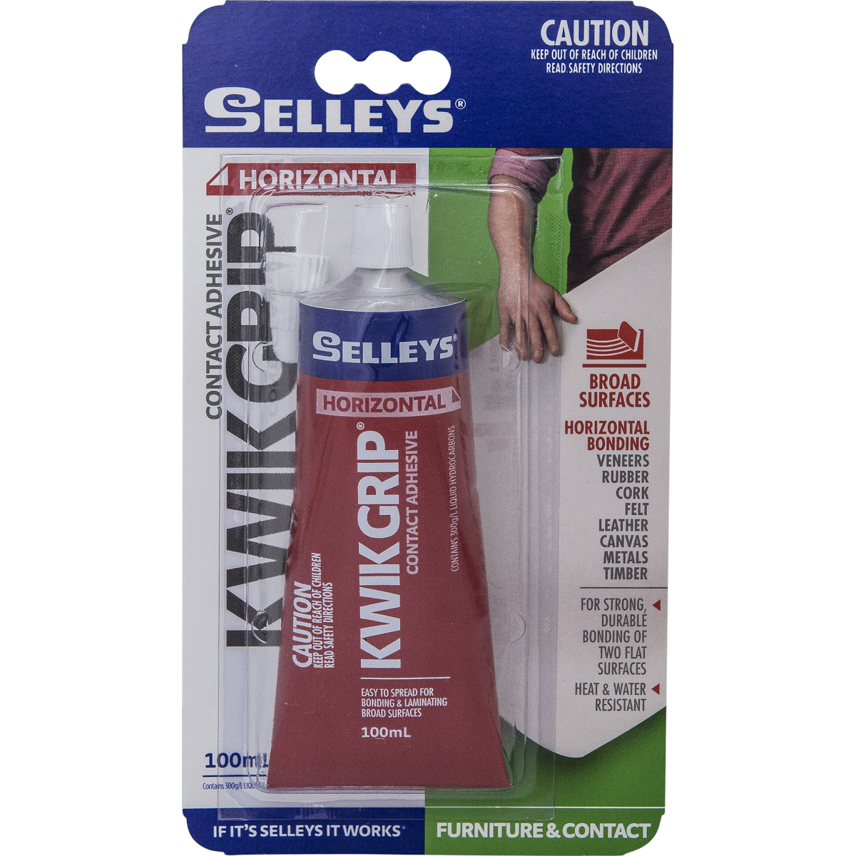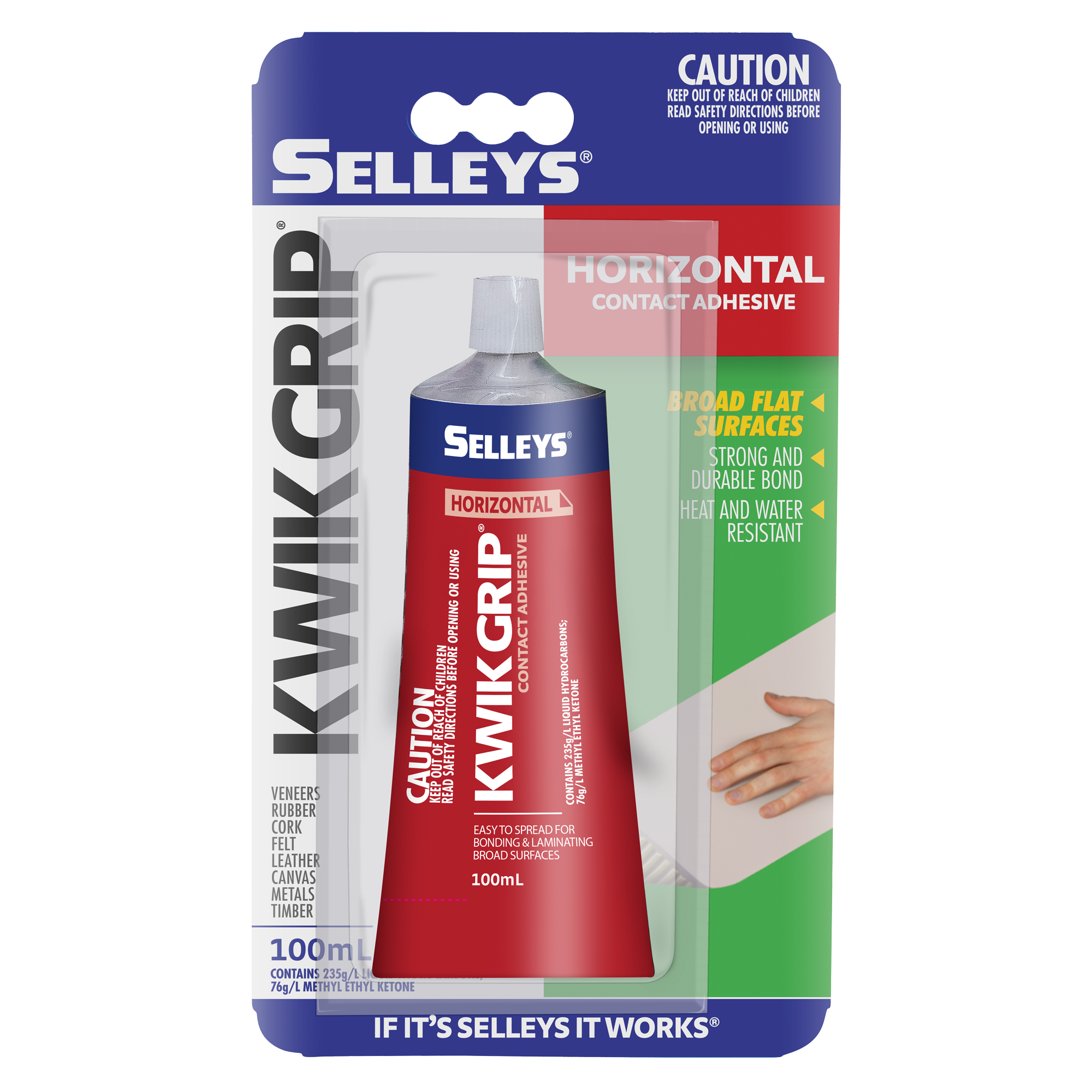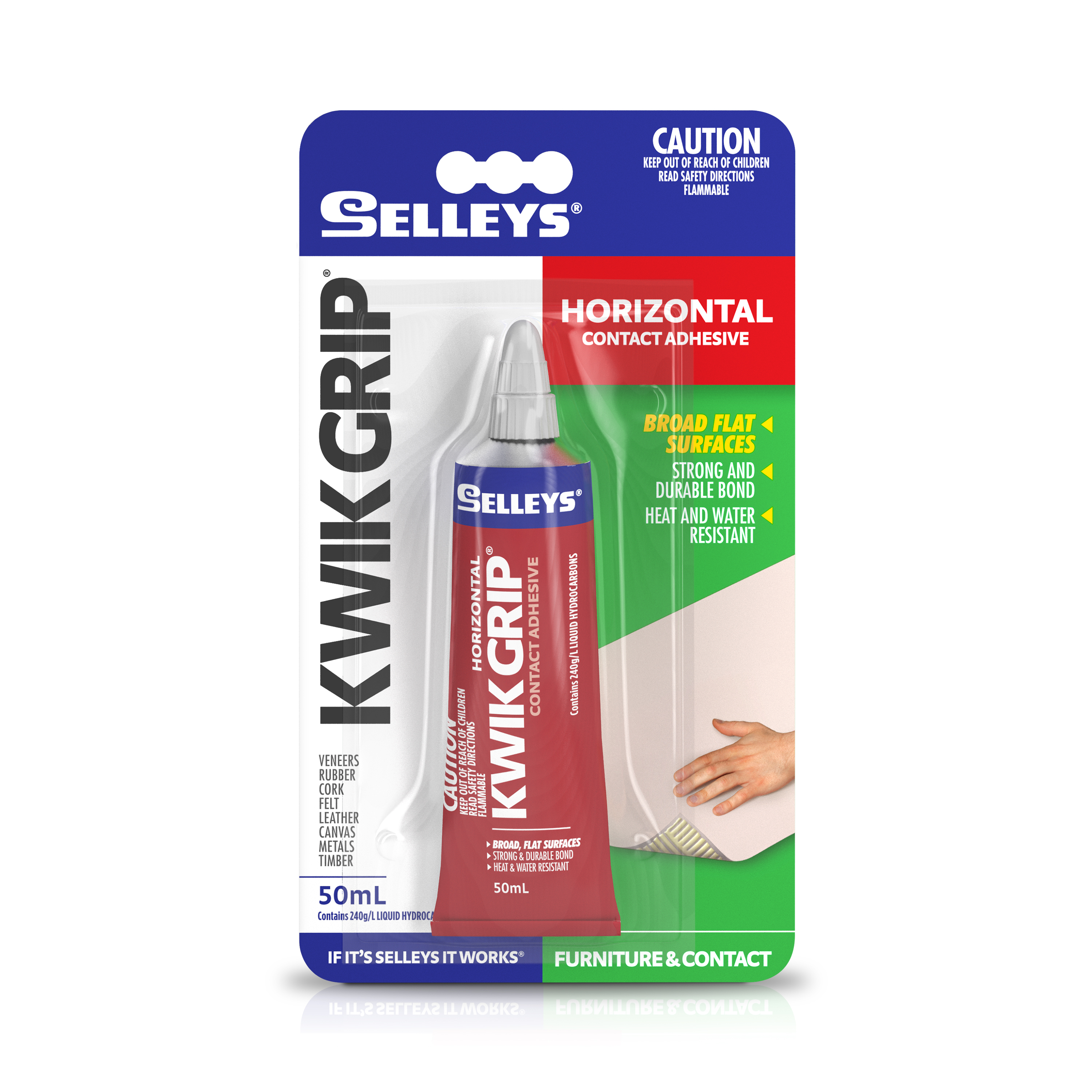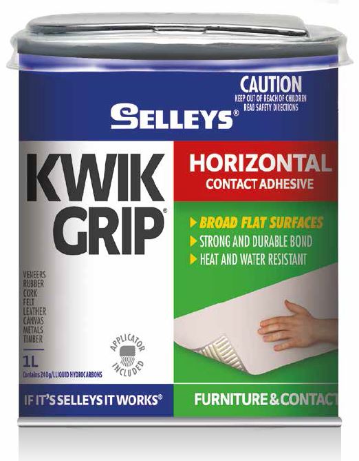 Selleys Kwik Grip® Horizontal is a heat resistant, solvent-based, flexible contact adhesive that forms an instant bond on contact of two surfaces.