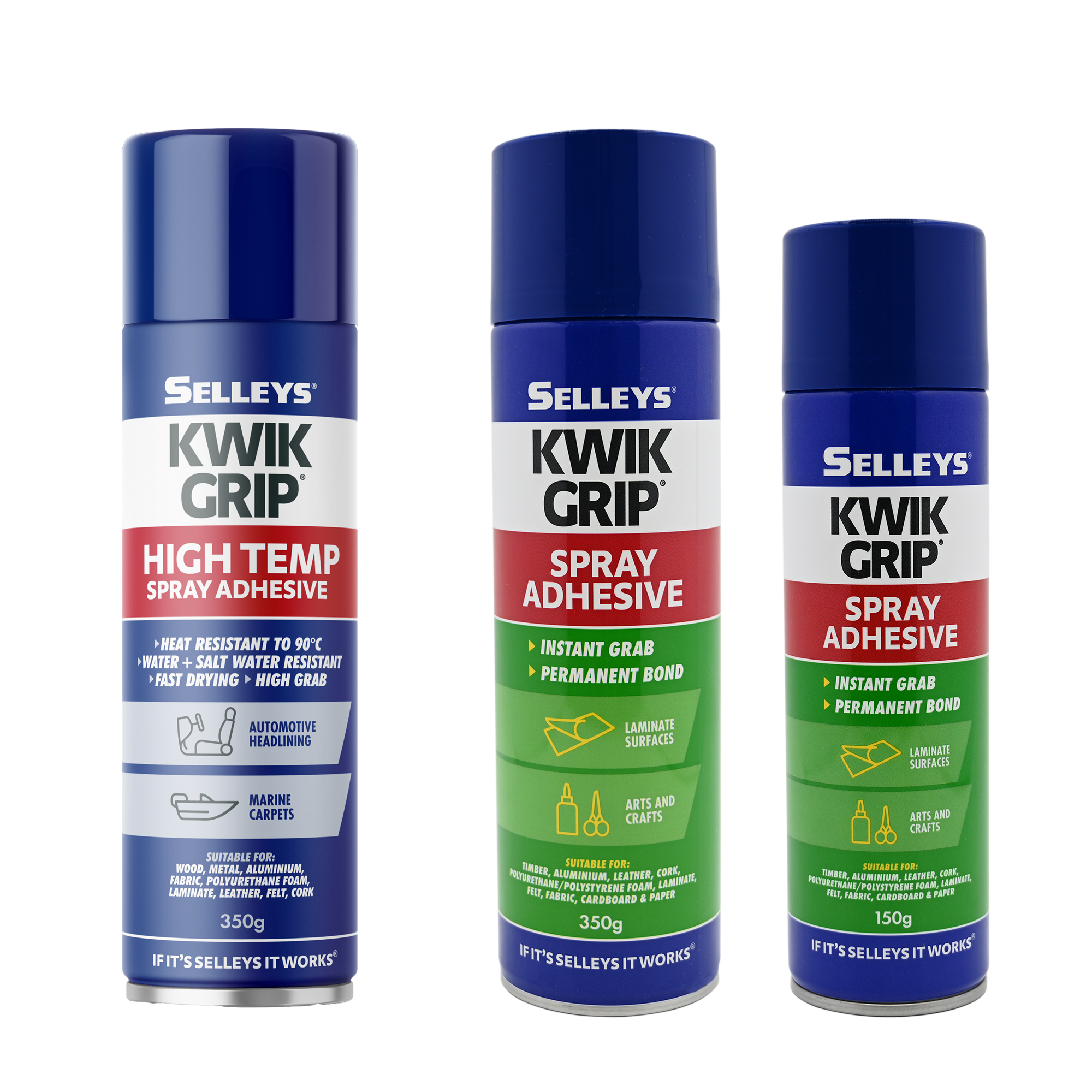 Selleys Kwik Grip® Spray is a clear fast drying, spray adhesive that forms an instant bond on contact of two sprayed surfaces. The spray application allows for a fine film of adhesive to be applied across surfaces. It dries colourless and produces a durable bond on both adsorbent and non-absorbent surfaces.