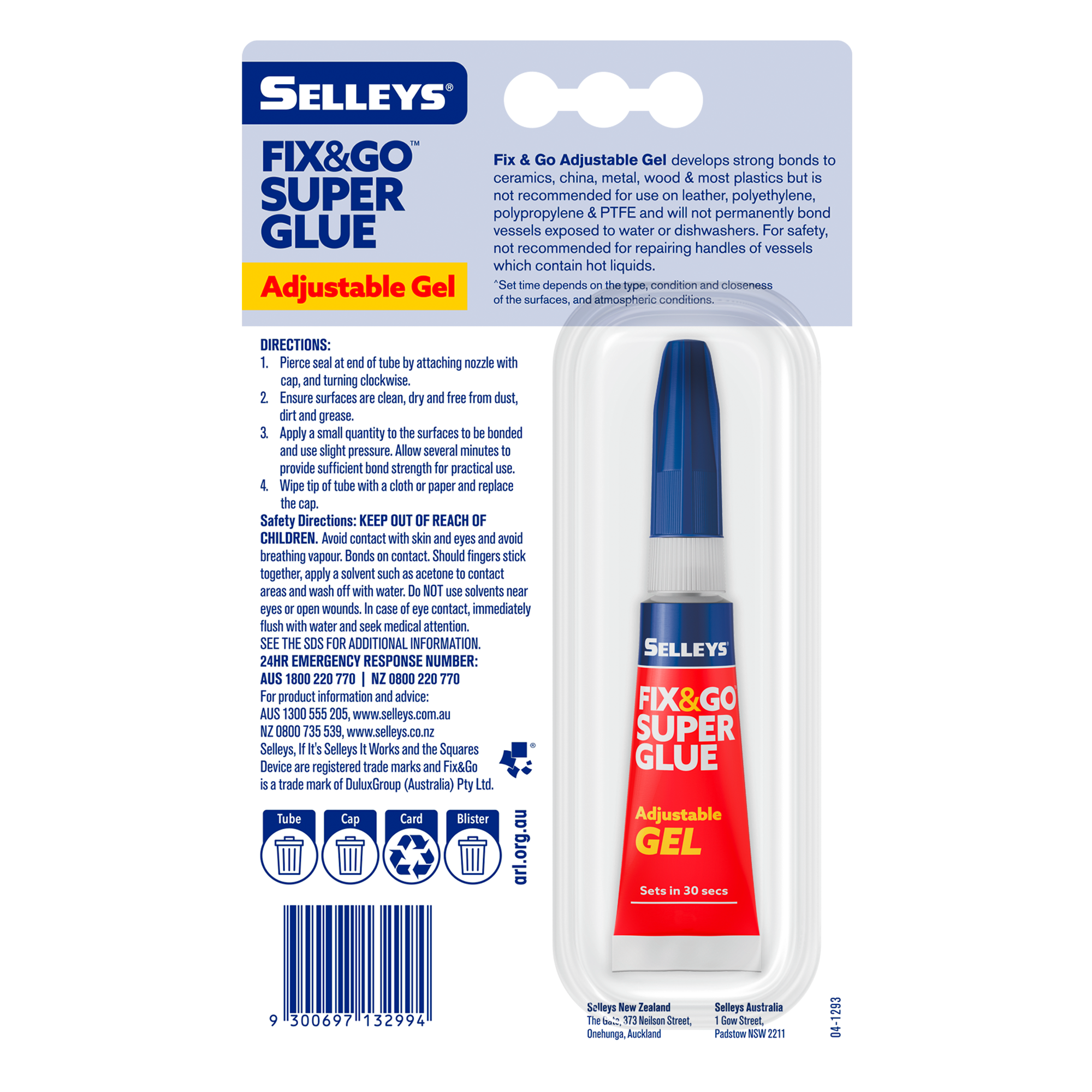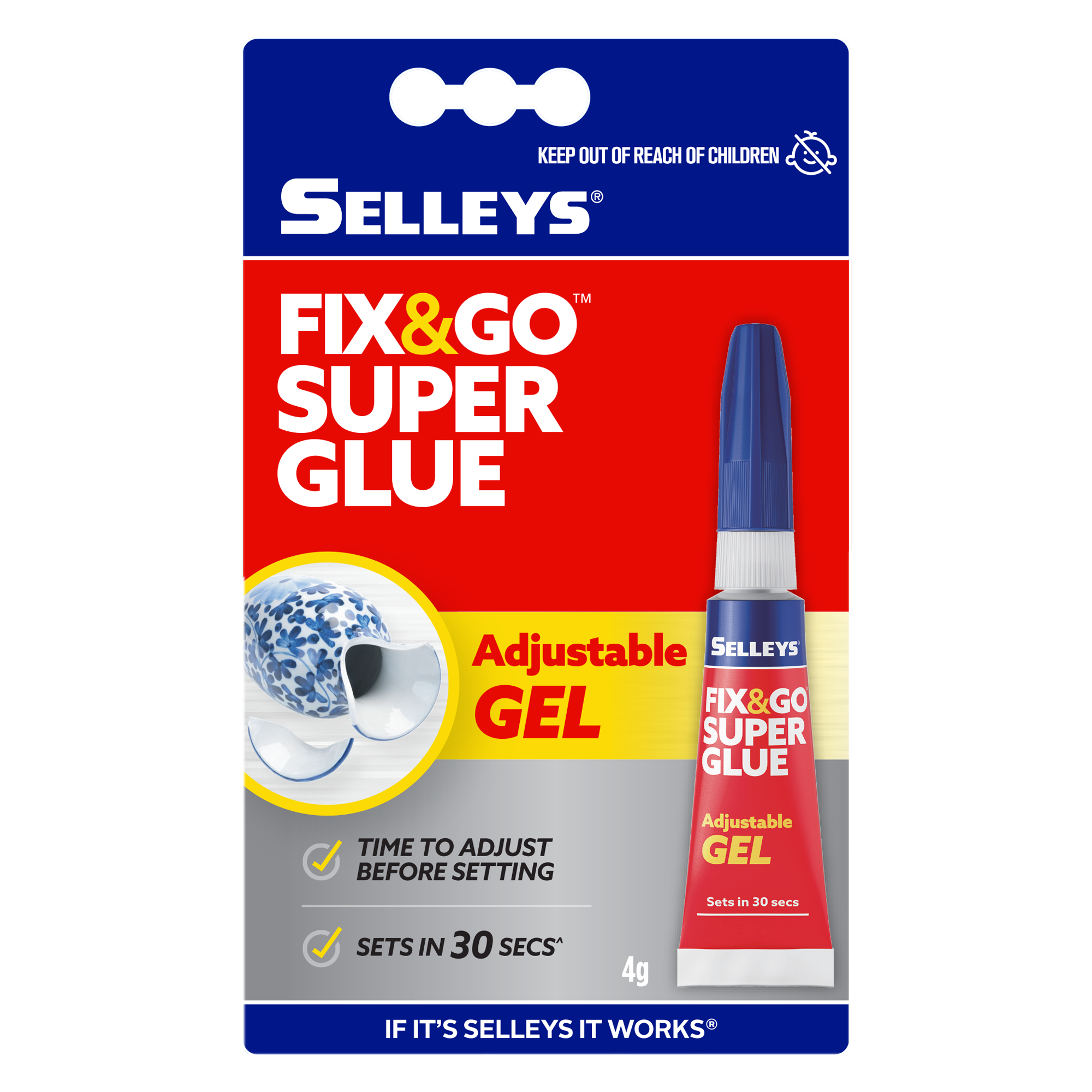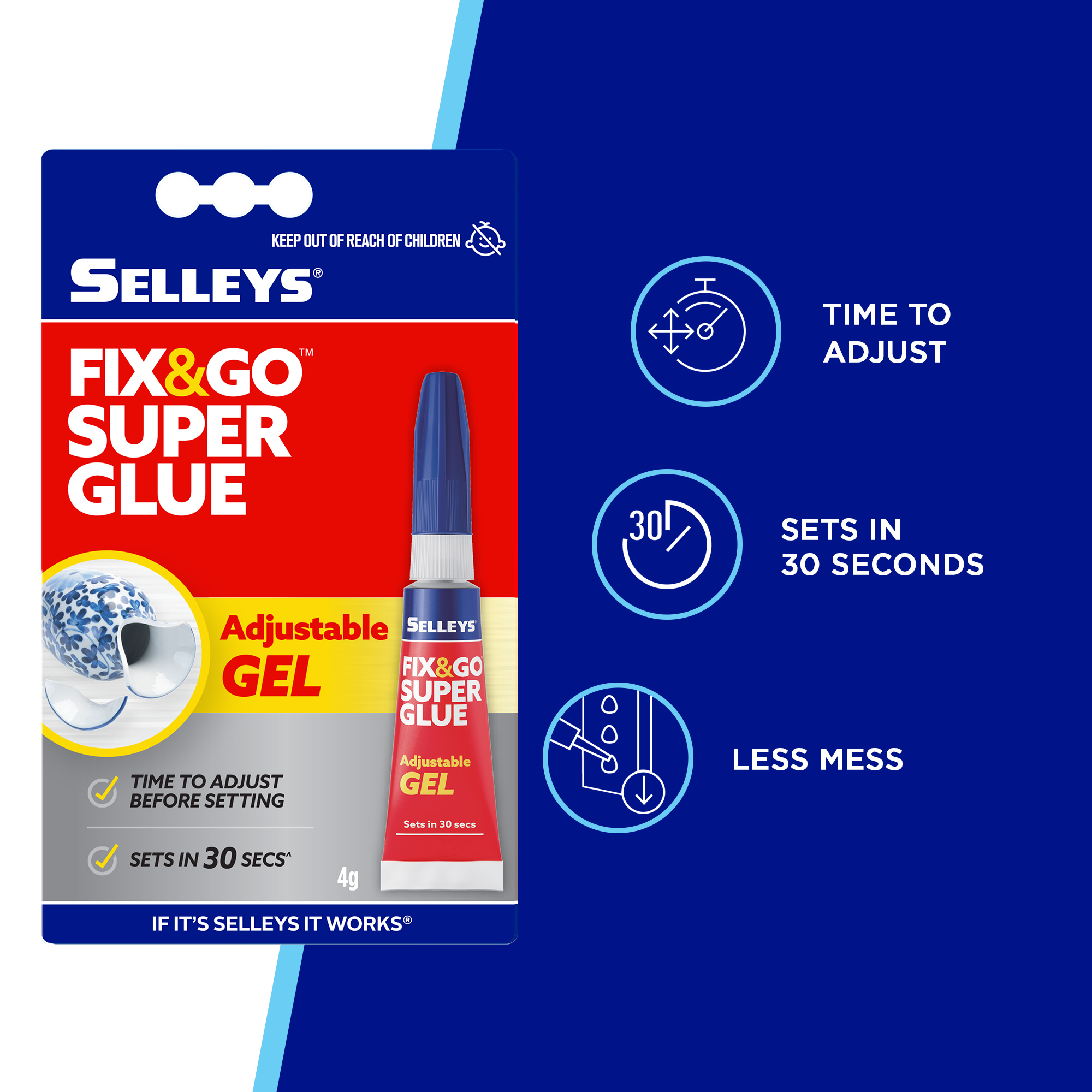 Selleys Fix & Go Adjustable Gel is ideal for everyday household repairs. It sets in 30 seconds, allowing time for consumers to adjust their fix to perfectly align their break. It's easy to use, requires no mixing and offers excellent adhesion to a variety of substrates.