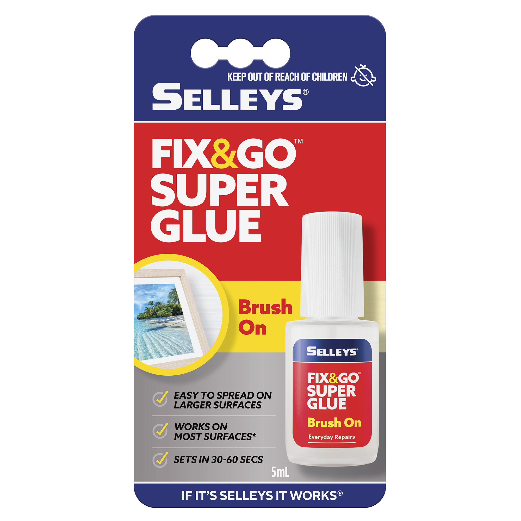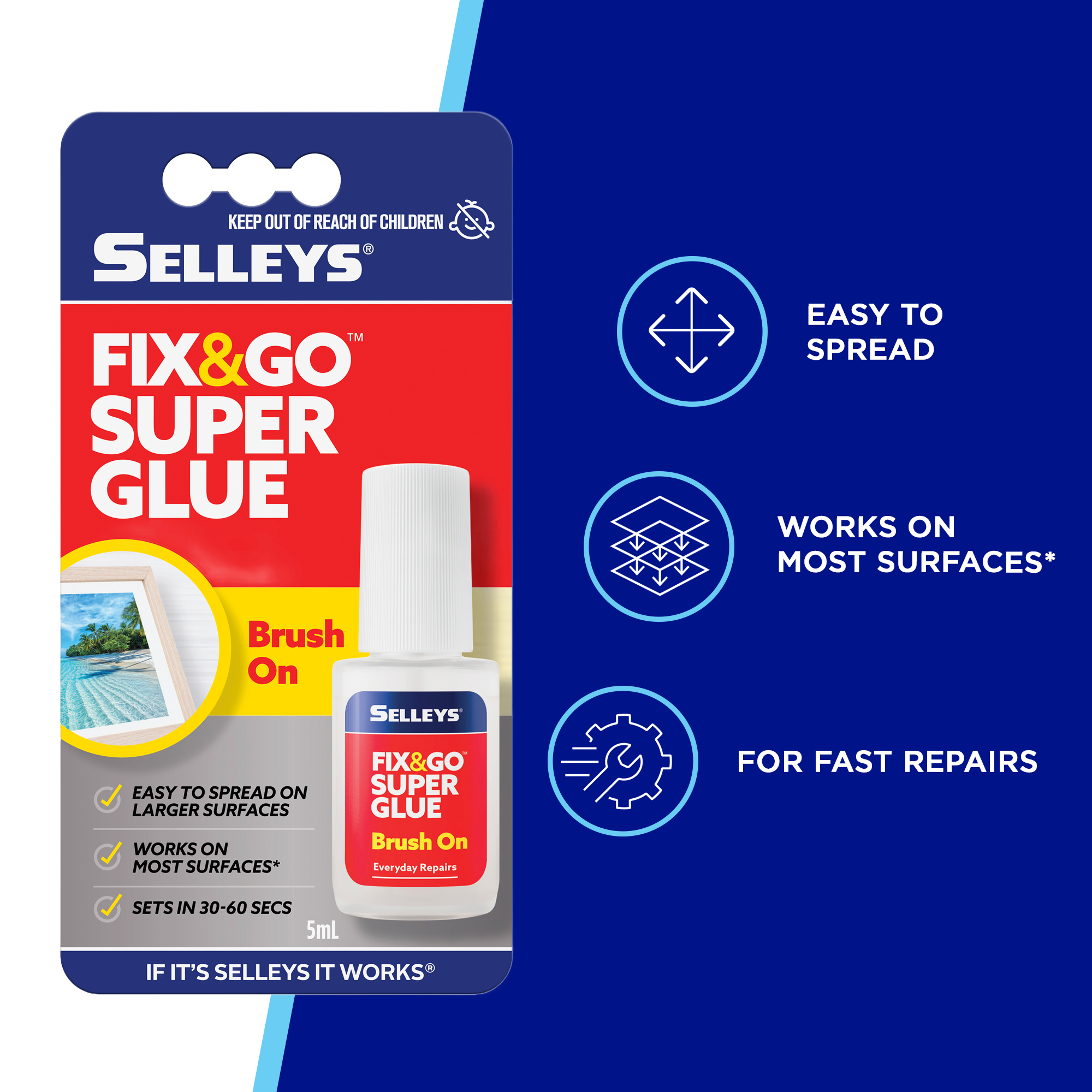 Selleys Fix&Go Brush On Supa Glue is for all types of household repairs and comes with a convenient brush that makes repairs so easy. The bottle has a special insert so it won’t spill if knocked over on a flat surface^.