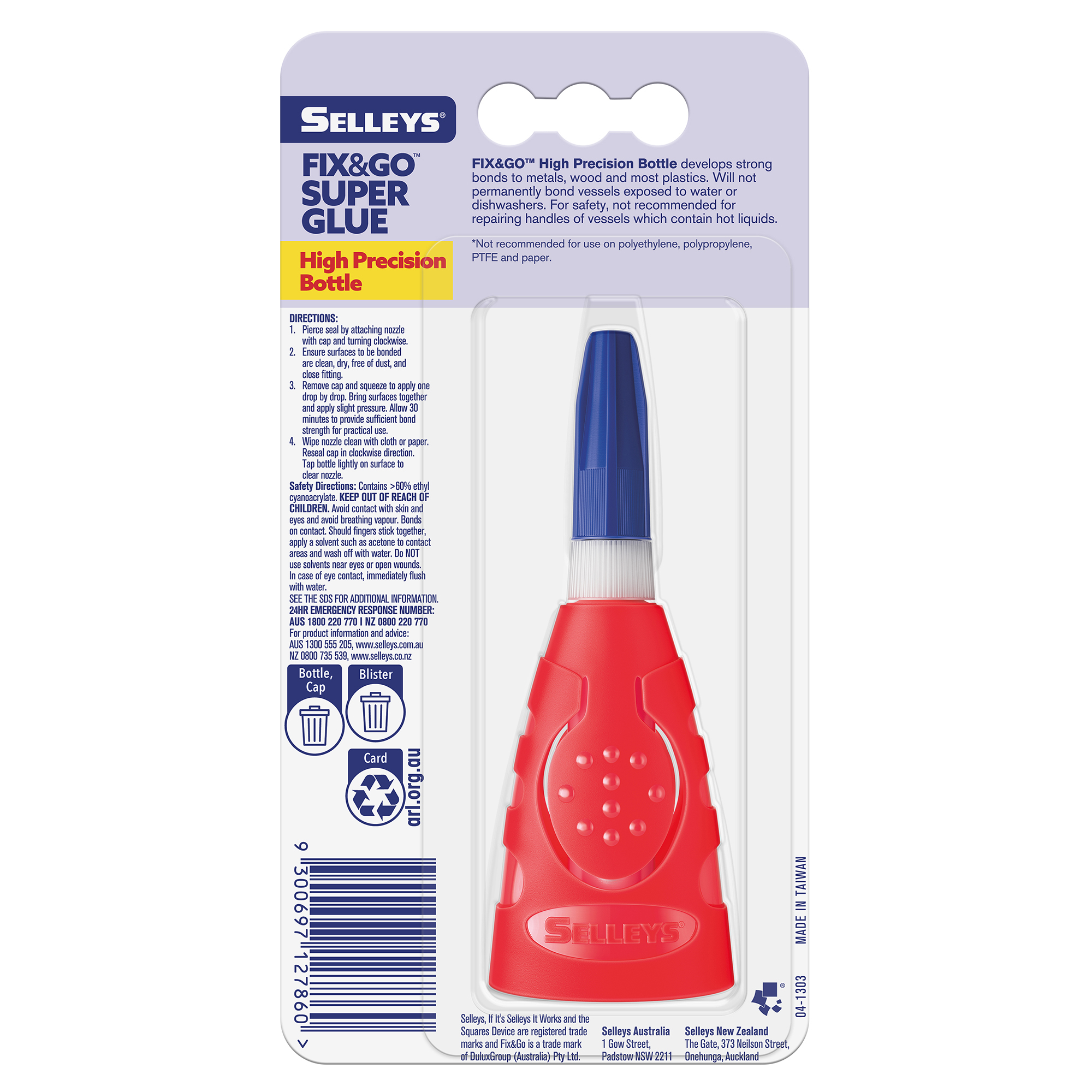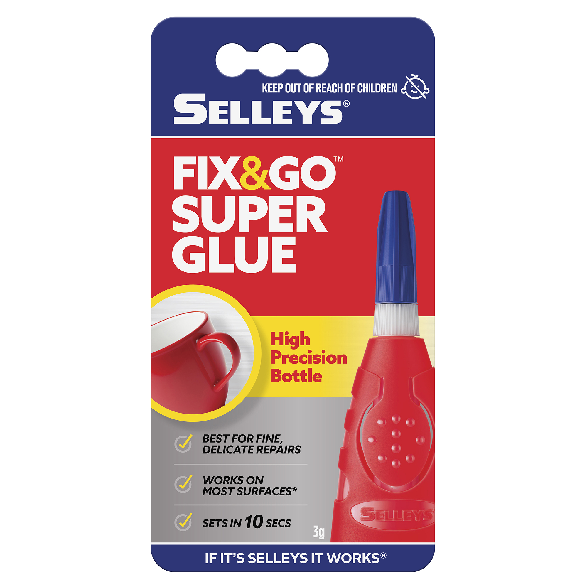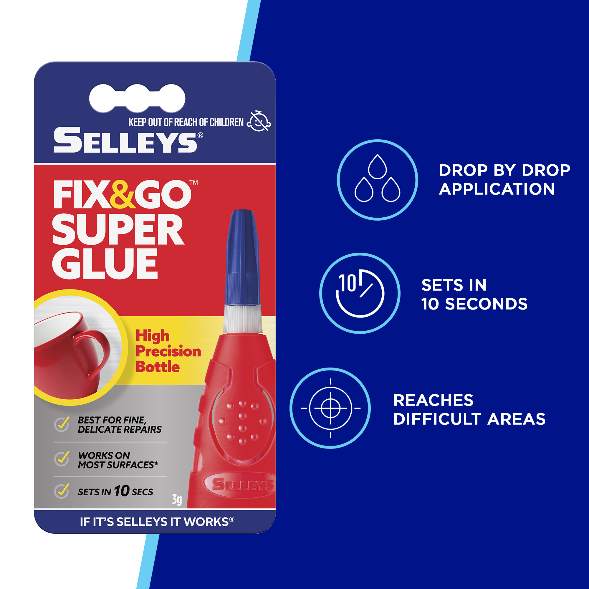 Selleys Fix&Go High Precision Bottle Supa Glue is a fast setting super glue in a convenient bottle that allows easy, controlled and precise application. Glue saver nozzle helps prevent mess by retracting partly dispensed glue droplets.