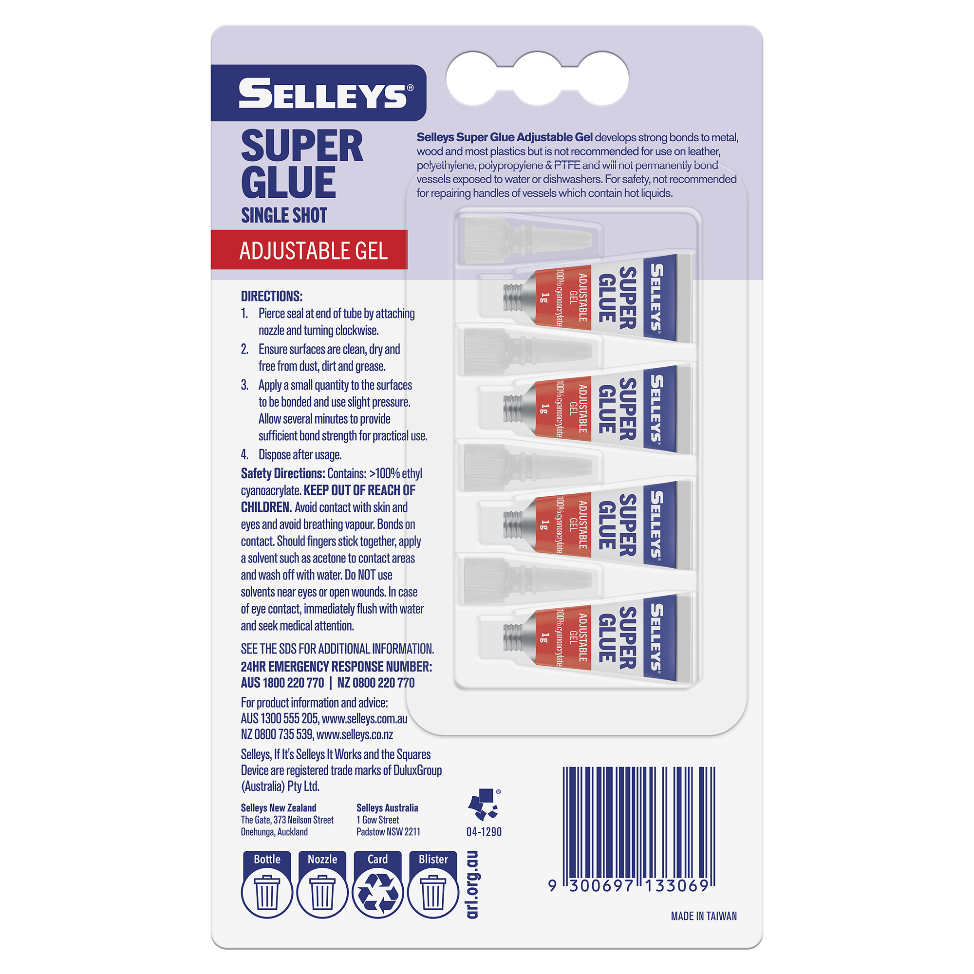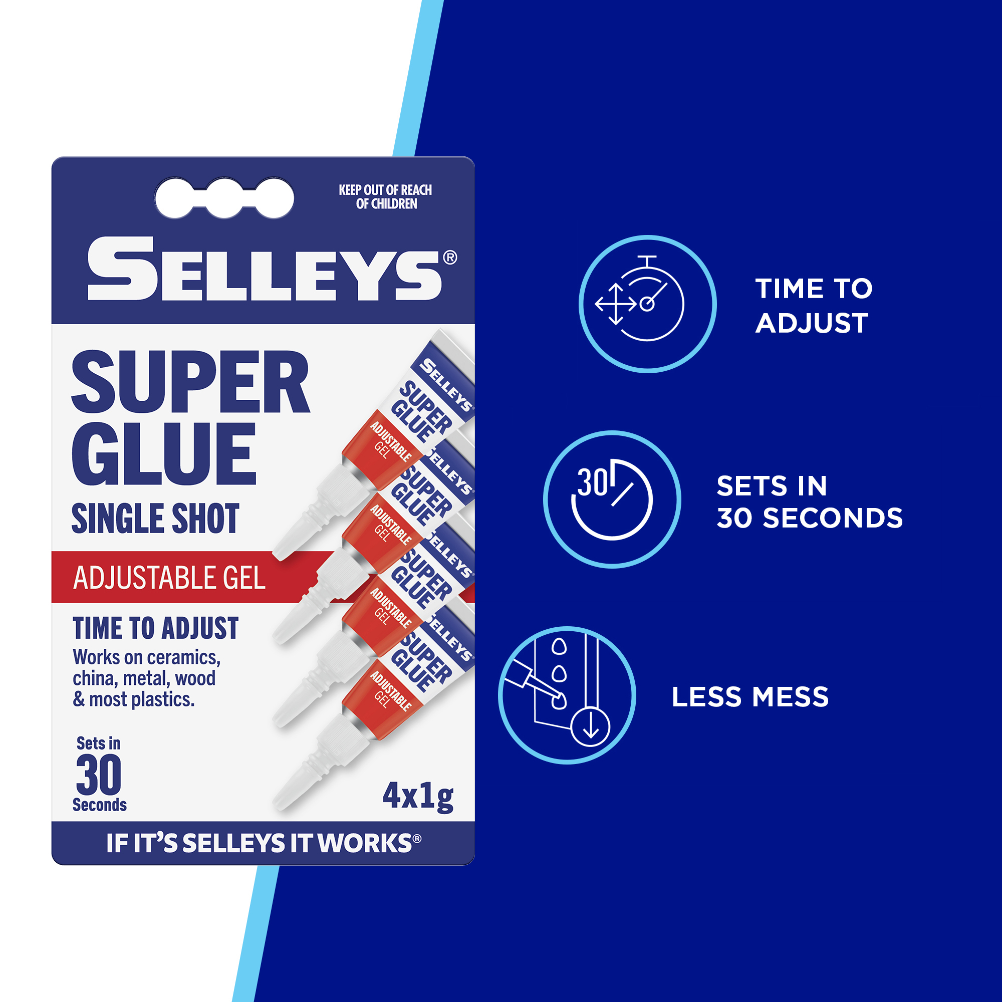 Selleys Super Glue Adjustable Gel is ideal for everyday household repairs. It sets in 30 seconds, allowing time for consumers to adjust their fix to perfectly align their break. It's easy to use, requires no mixing and offers excellent adhesion to a variety of substrates.