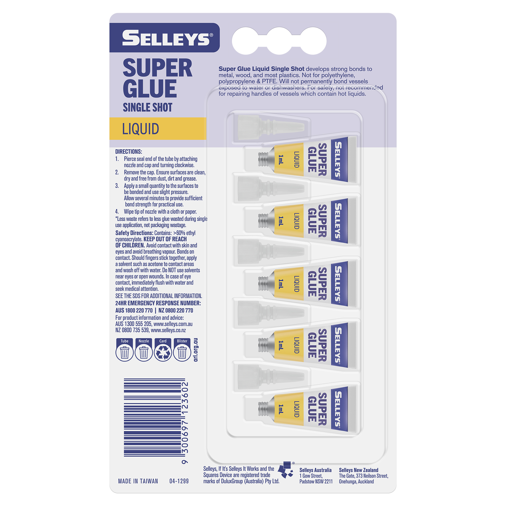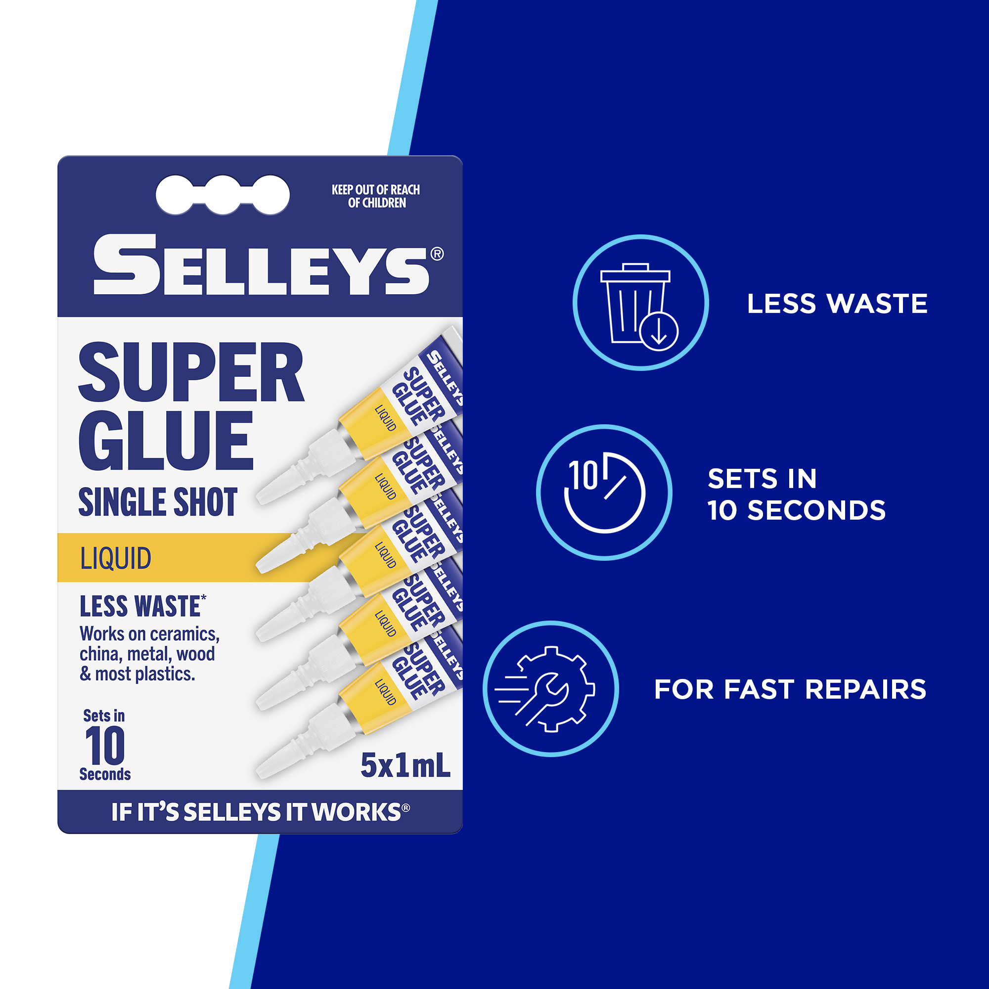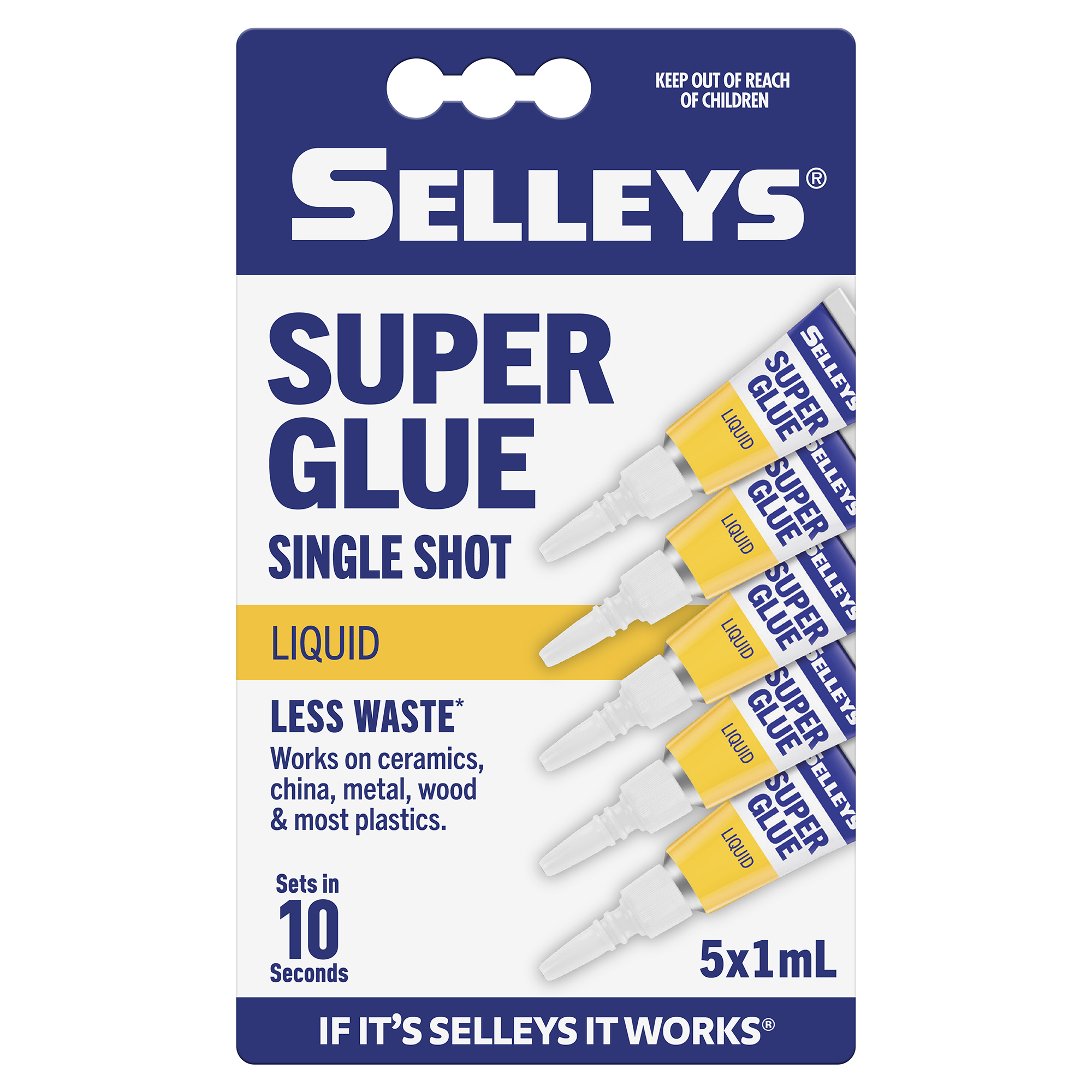 Selleys Super Glue Single Shot is the tried and tested glue that is great for all types of minor household repairs and provides less product was with a single use application. It requires no mixing, gives a strong bond in seconds and dries clear.