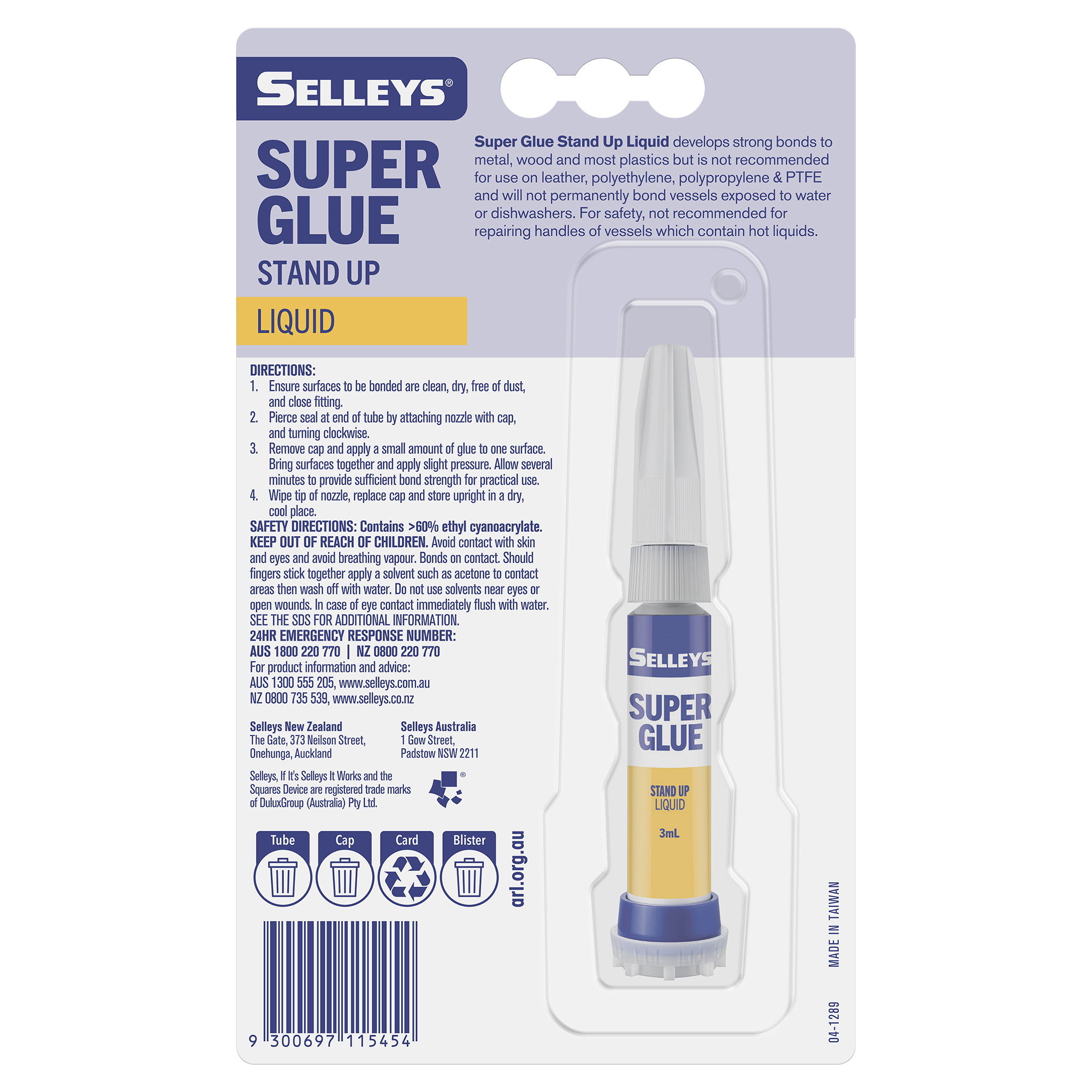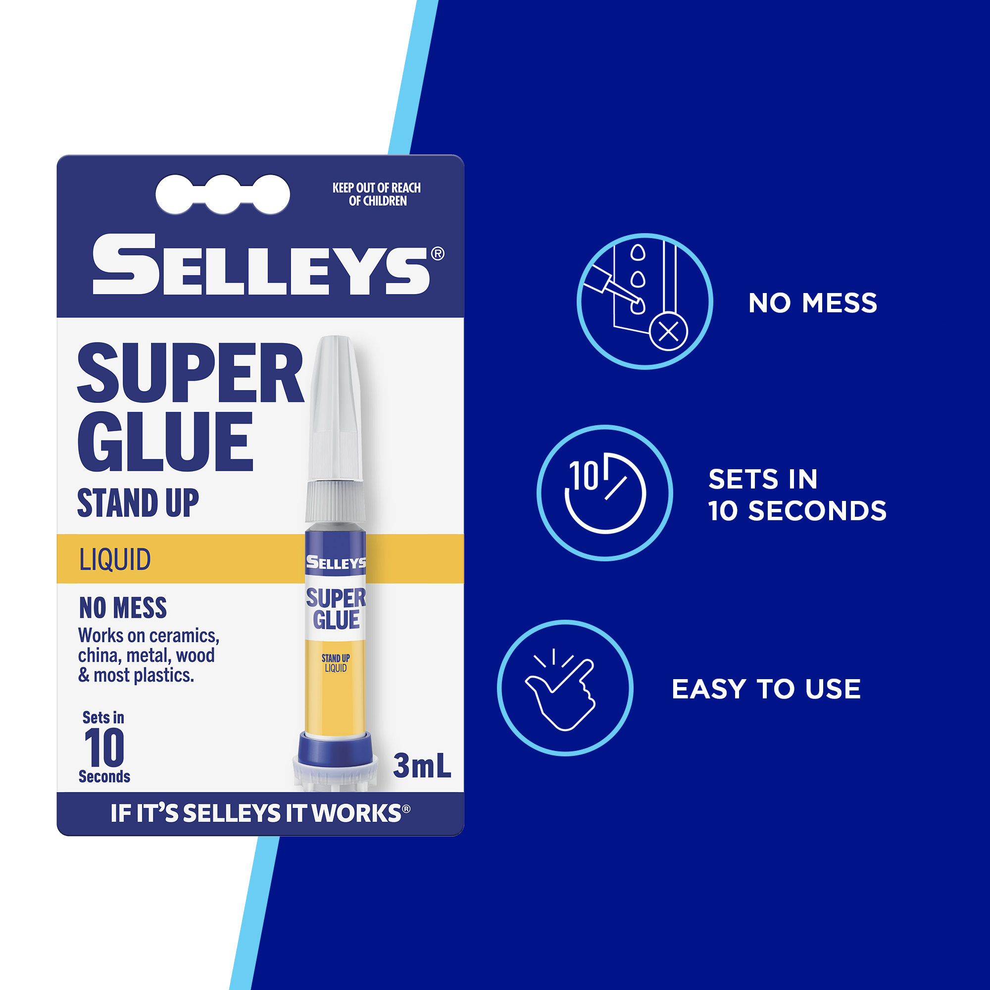 Selleys Super Glue Stand-up is great for all types of household repairs and leaves no mess on the benchtop. The stand up tube won't clog up since the product retracts back into the tube after use. It requires no mixing, gives a strong bond in seconds and dries clear.