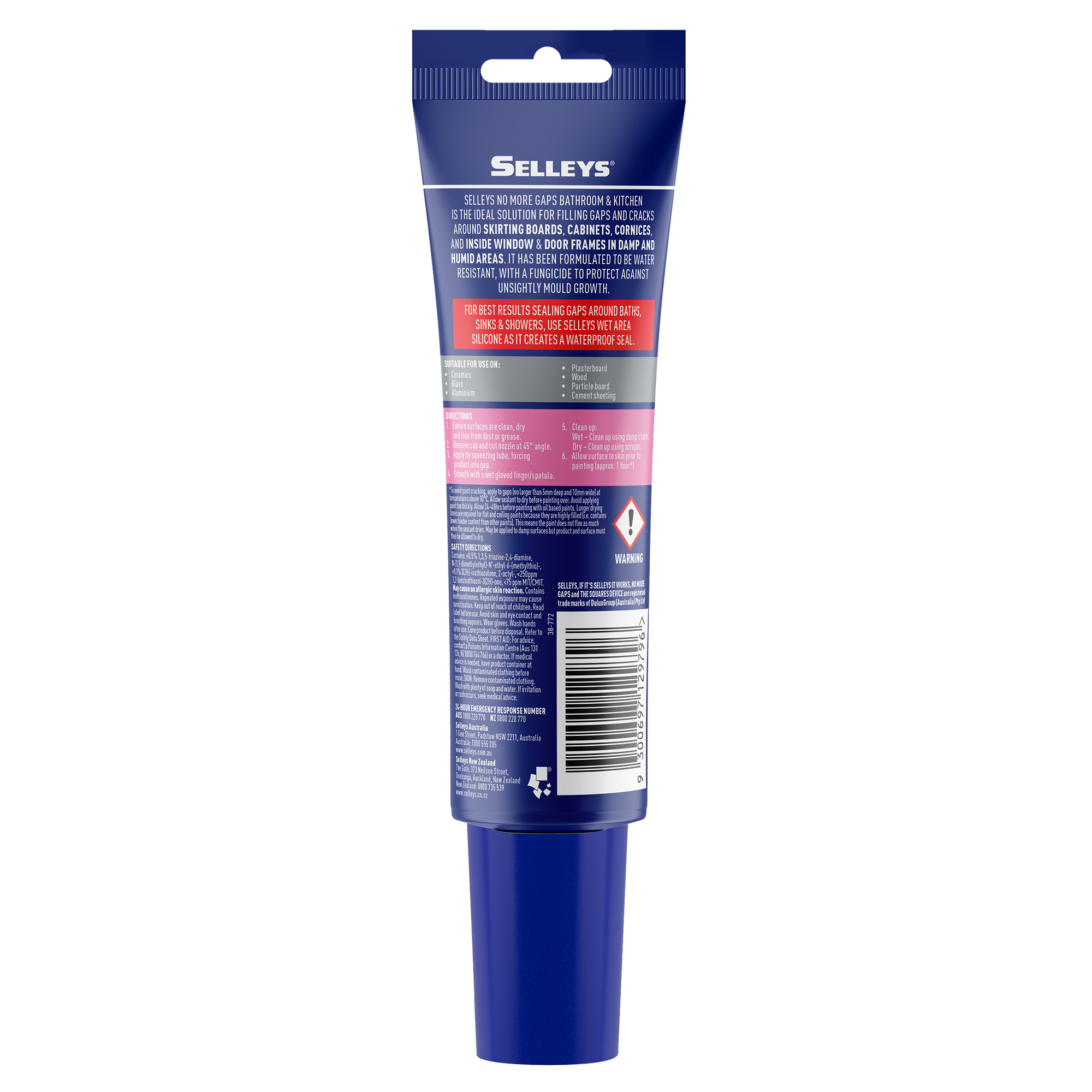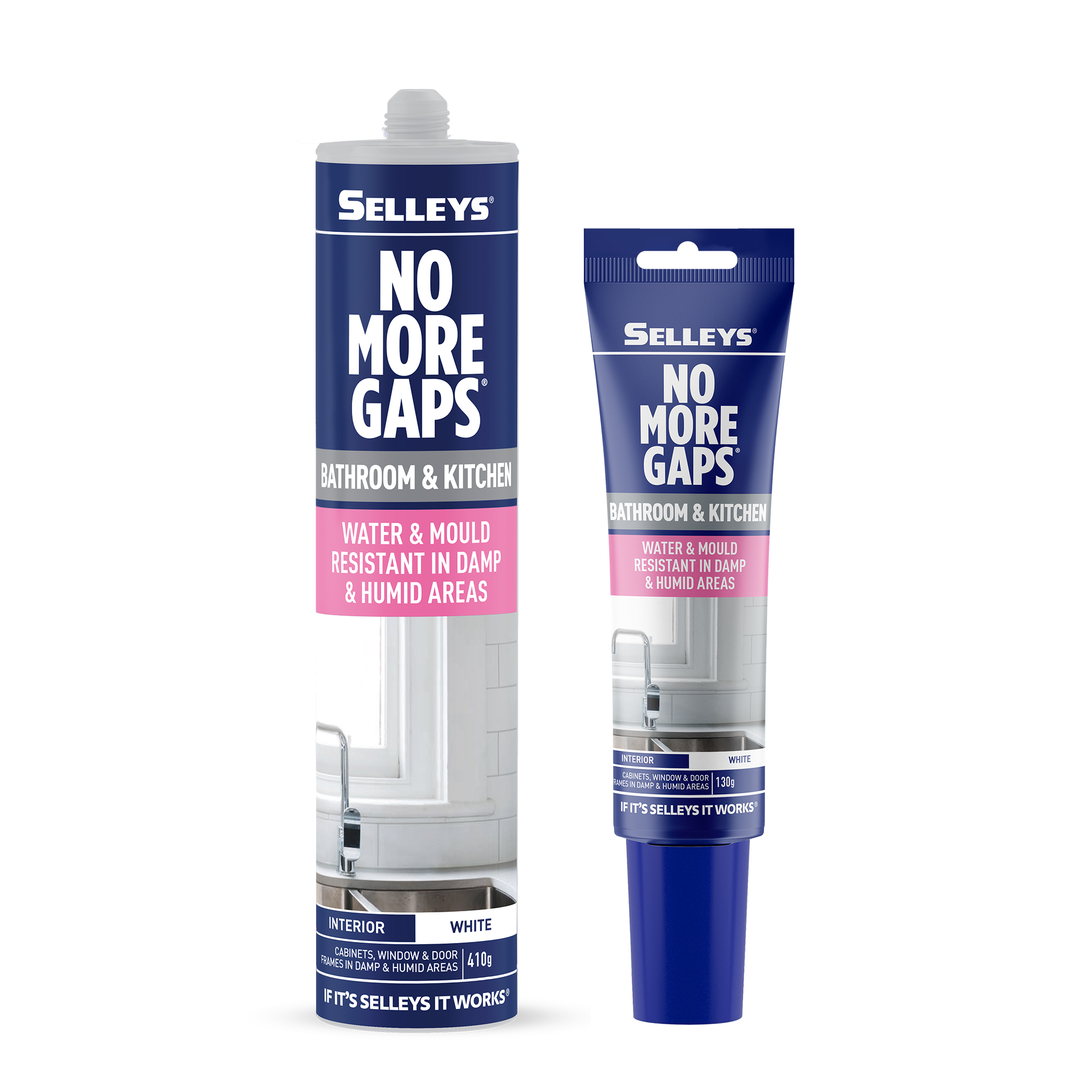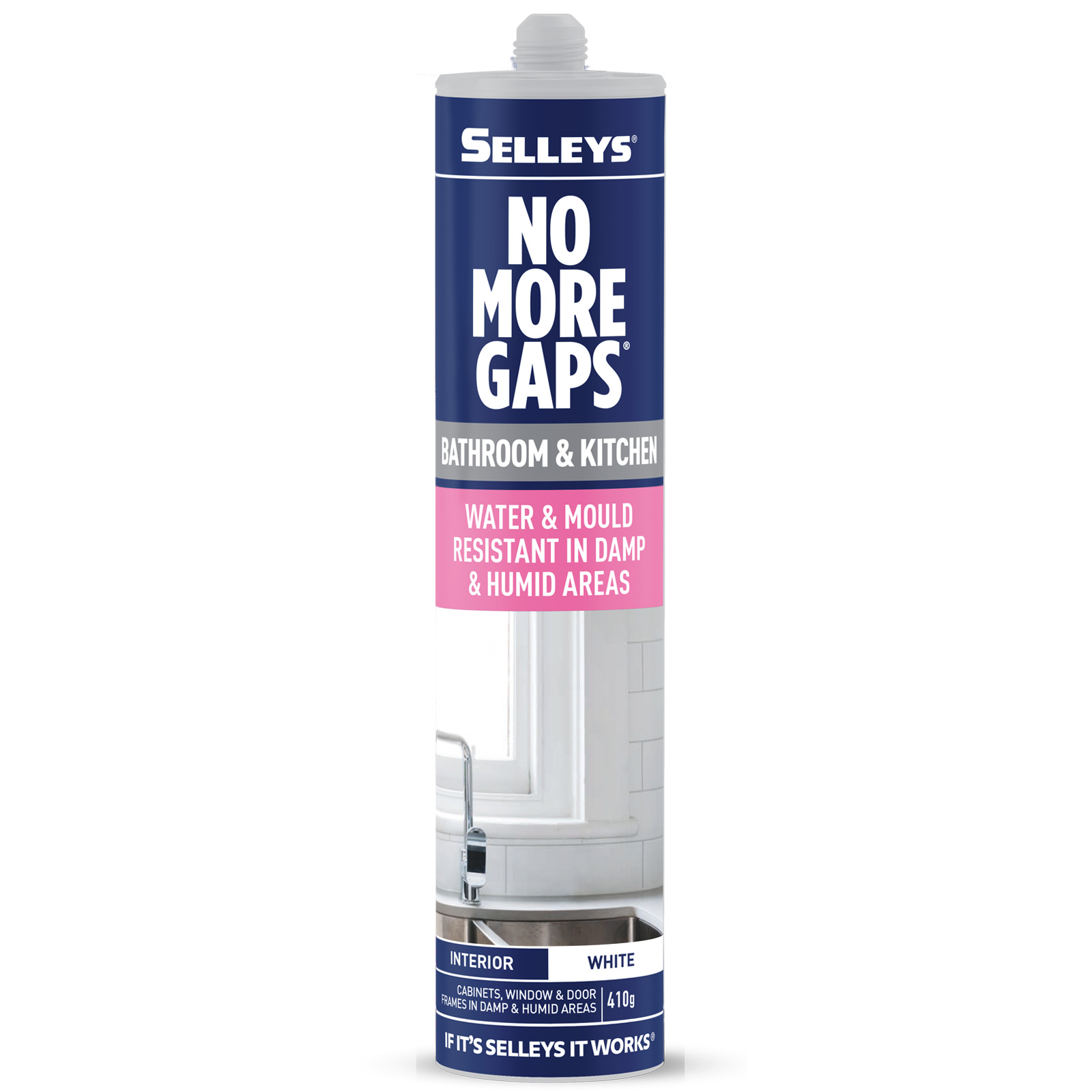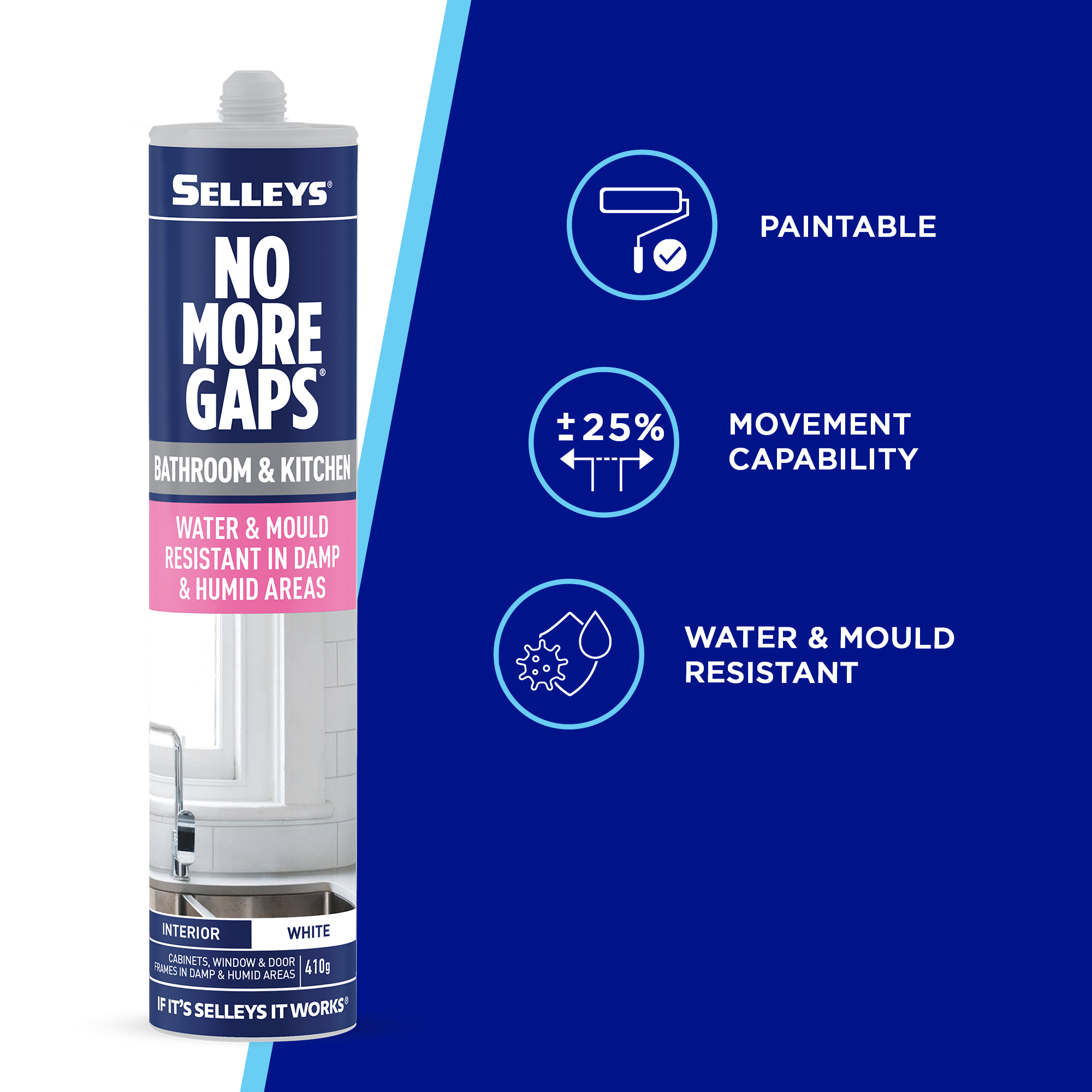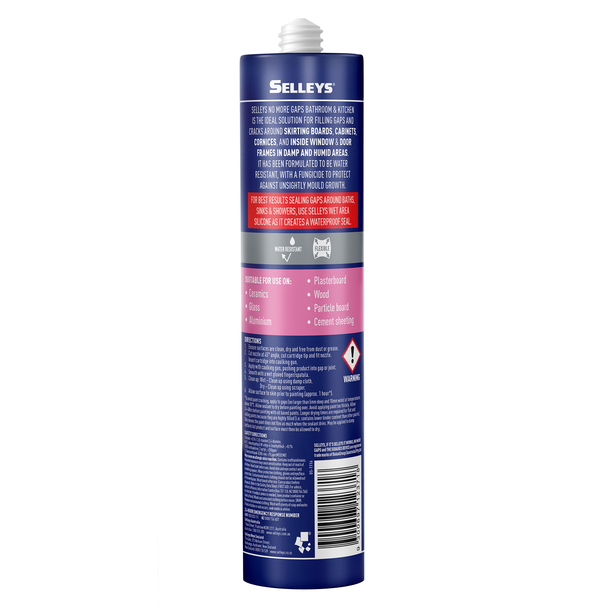 Selleys No More Gaps Bathroom & Kitchen is the ideal solution for filling gaps and cracks around skirting boards, cabinets, cornices, and inside window & door frames in damp and humid areas. It has been formulated to be water resistant, with a fungicide to protect against unsightly mould growth.