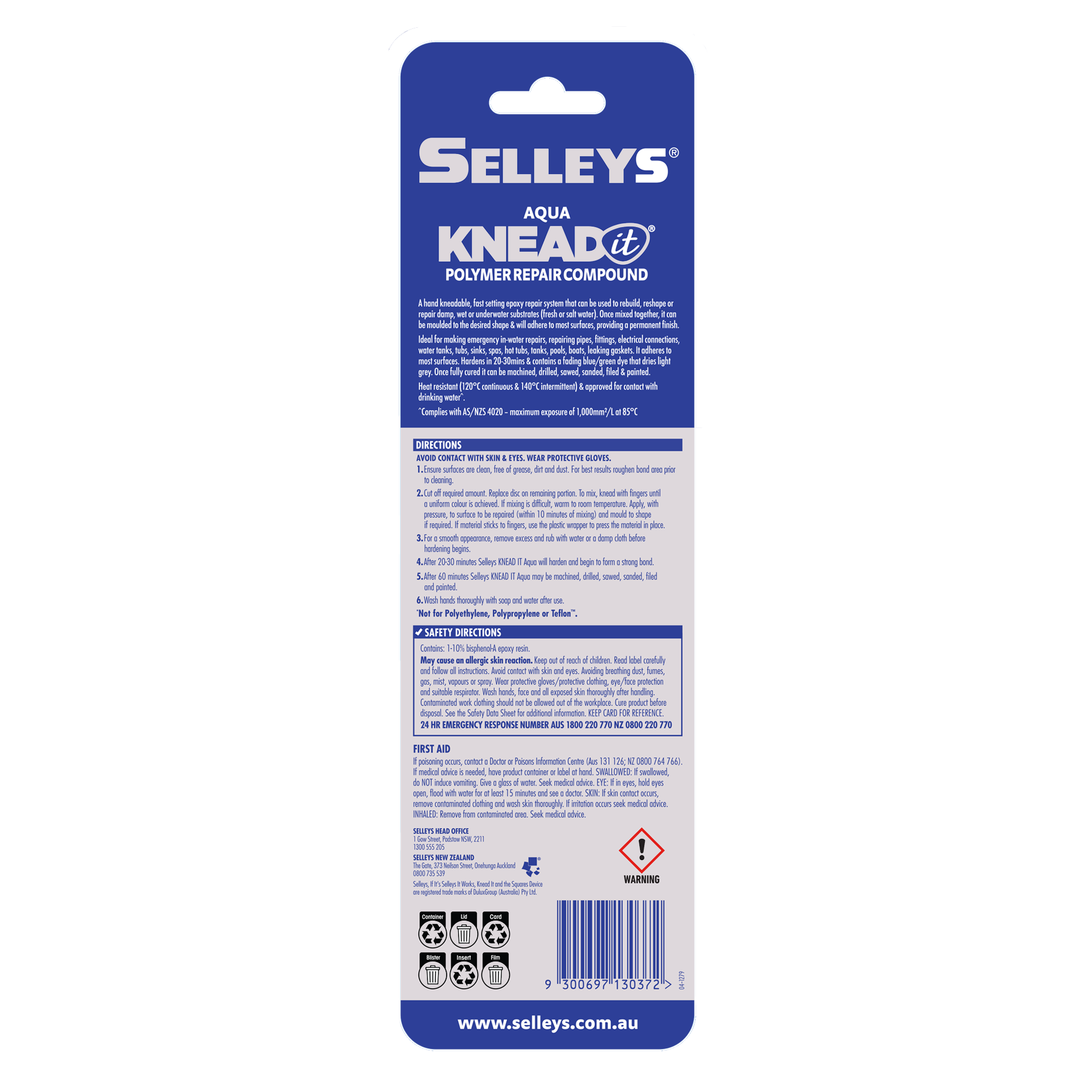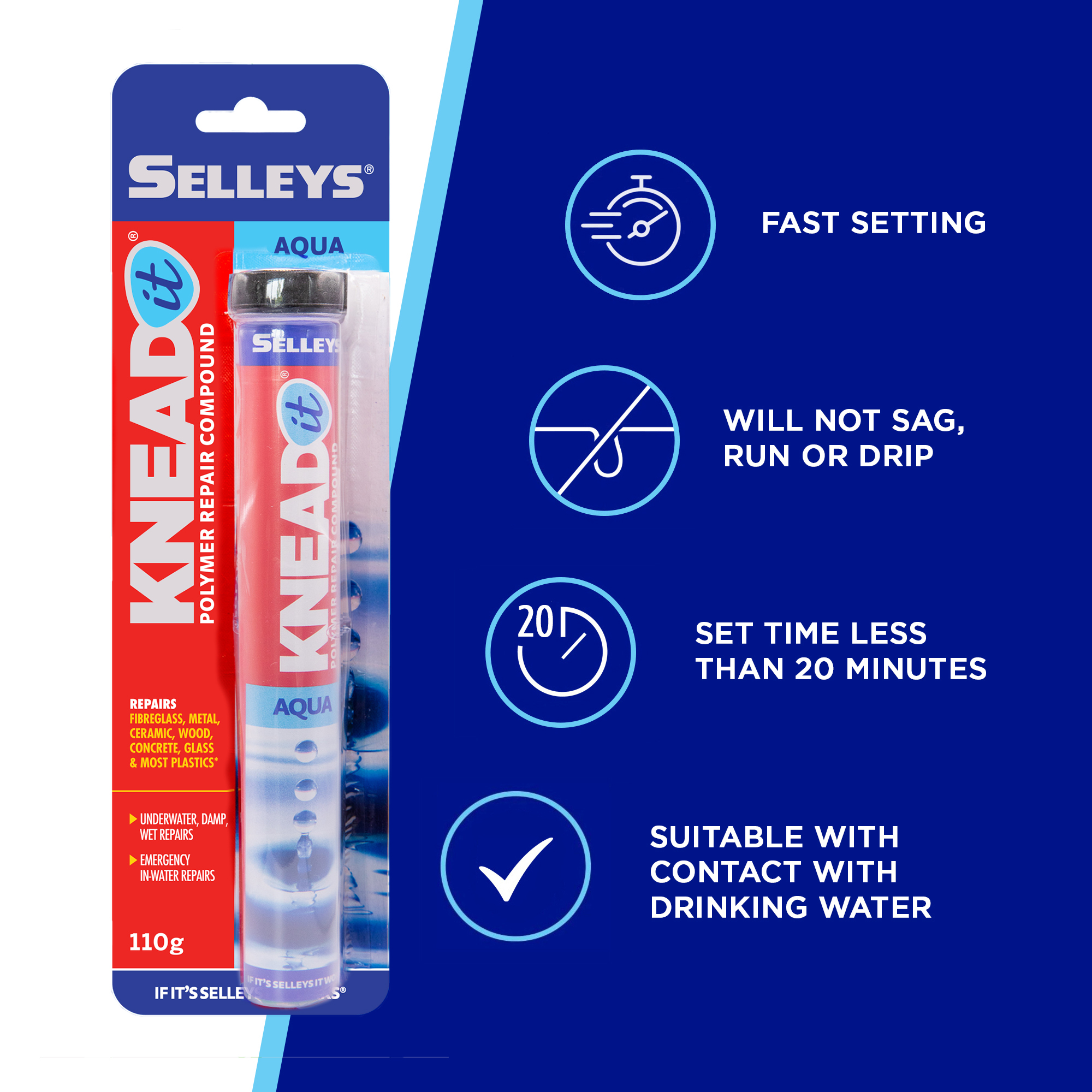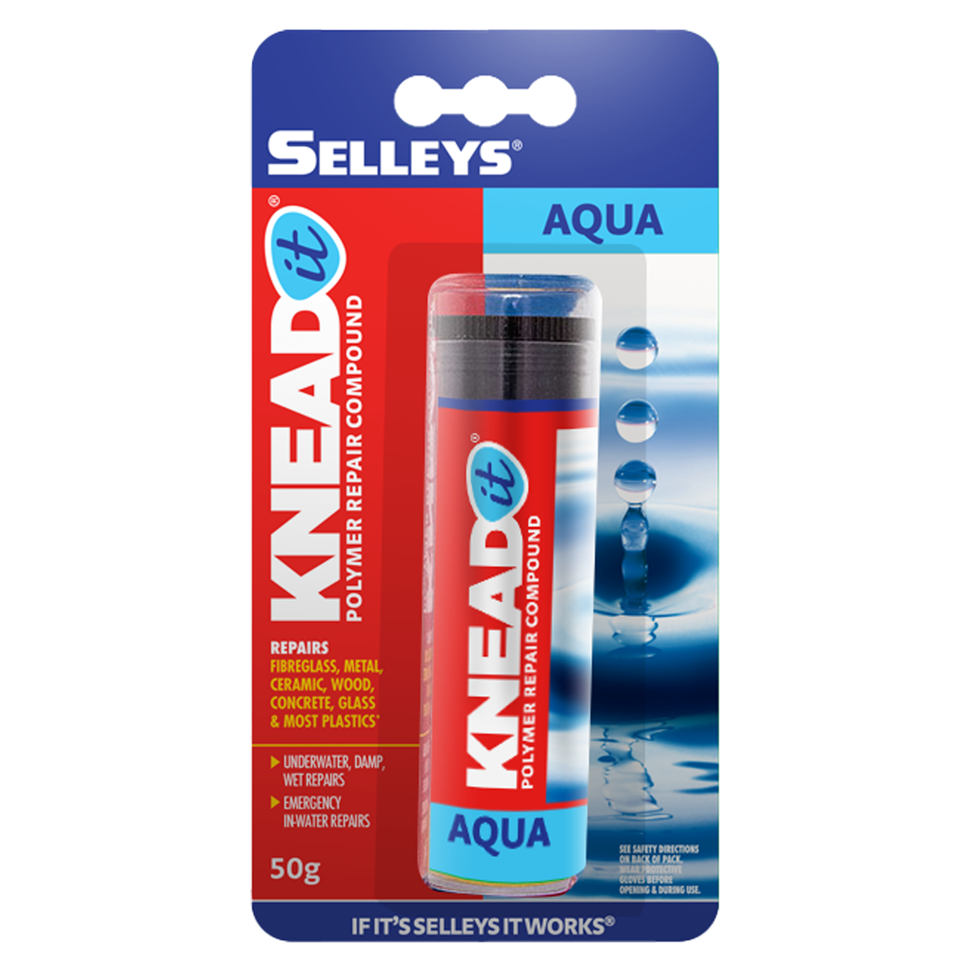 Selleys Knead It Aqua is a versatile hand kneadable, fast setting co-extruded epoxy repair system that can be used for repairing a multitude of things. It is especially suitable for application to damp, wet or underwater substrates.