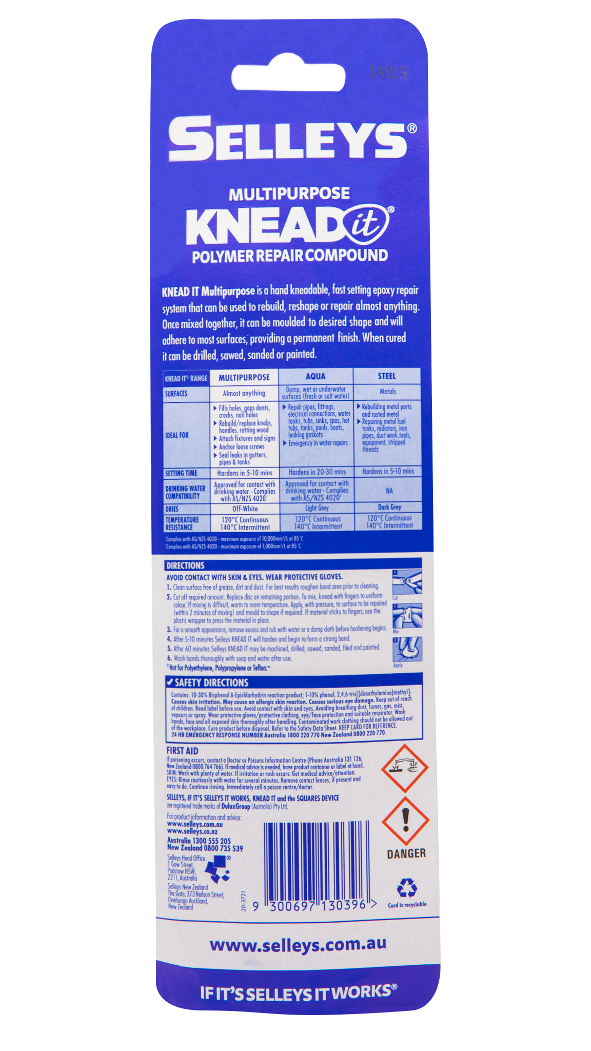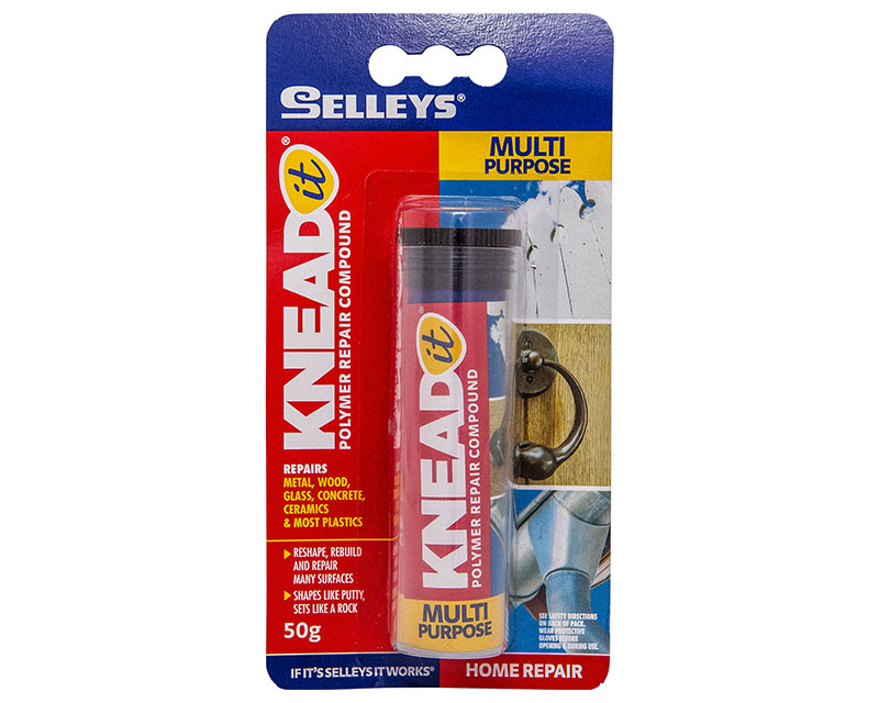Selleys Knead It Multipurpose is a versatile, hand kneadable fast setting epoxy putty that is ideal for repairing, rebuilding, reshaping or restoring almost anything. It can be drilled, filed, machined, screwed, sawn, sanded, stained and painted.