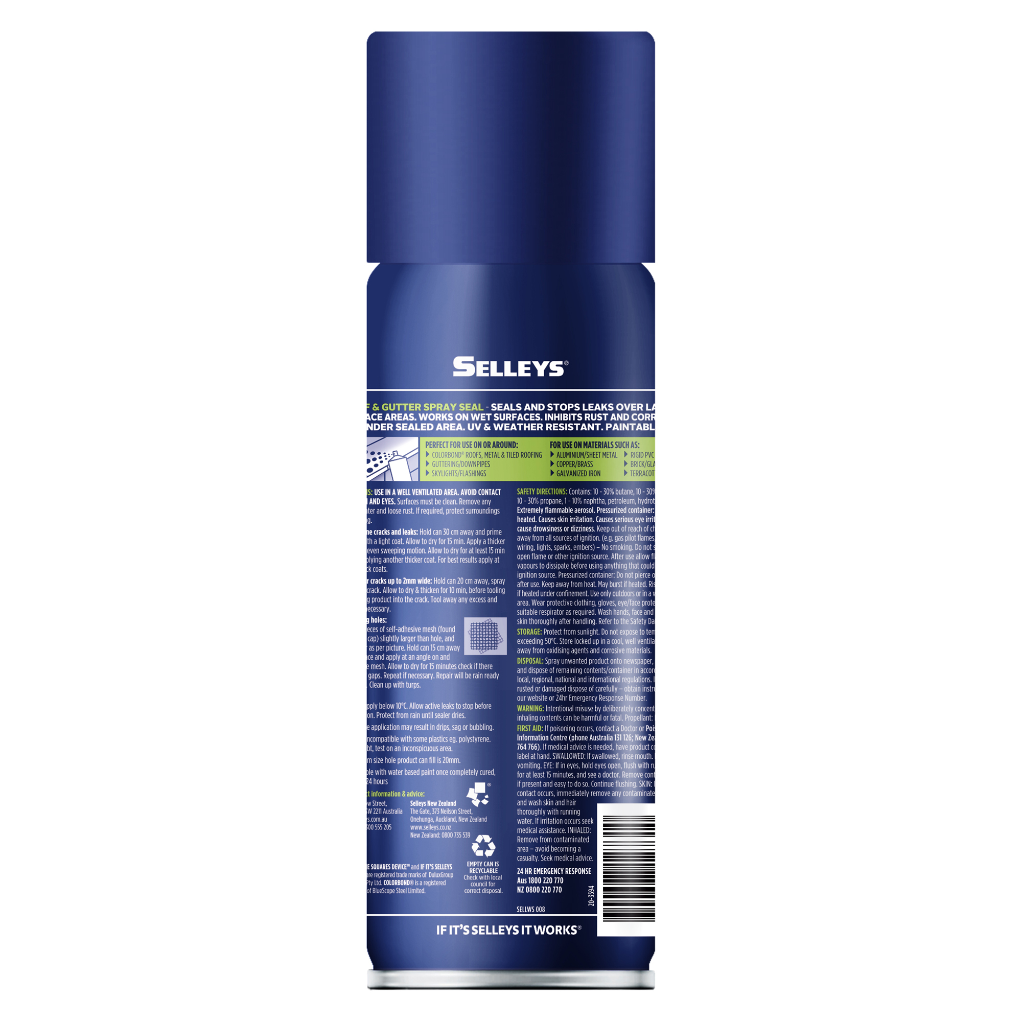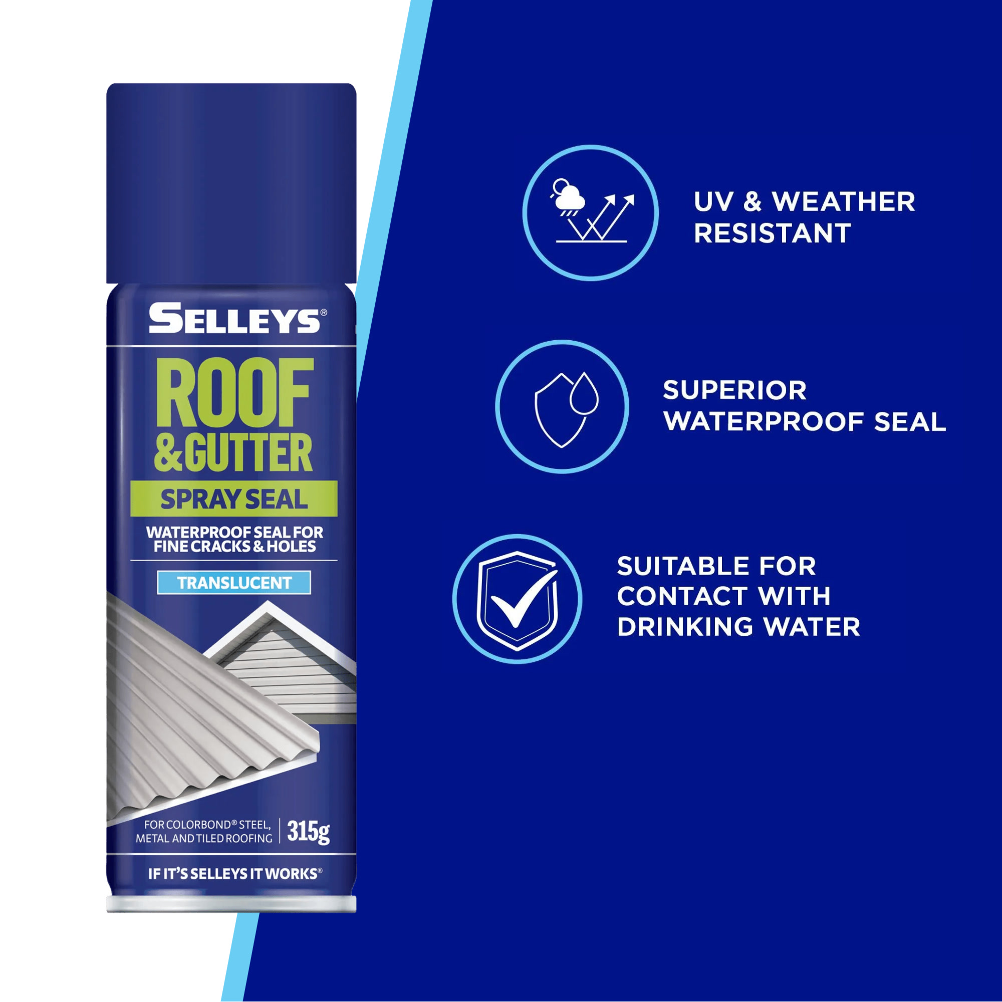 Selleys Roof & Gutter Spray Seal seals and stops leaks for fine cracks and holes over larger surface areas. It works on wet surfaces and is UV and weather resistant to provide a long lasting waterproof seal.