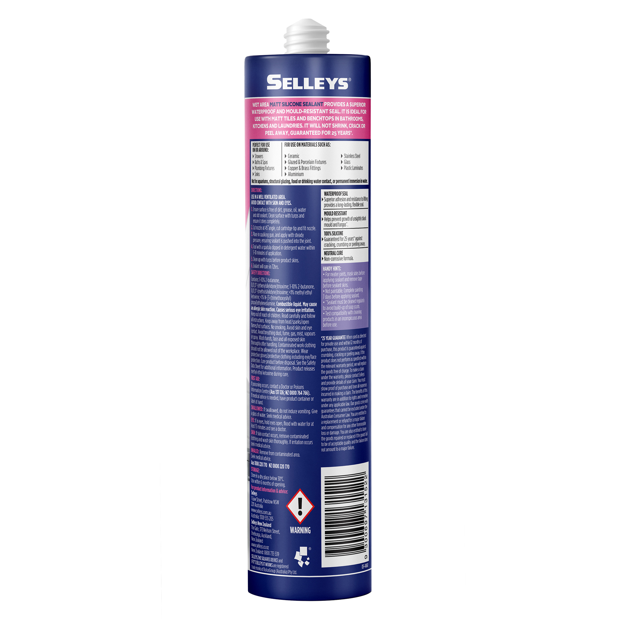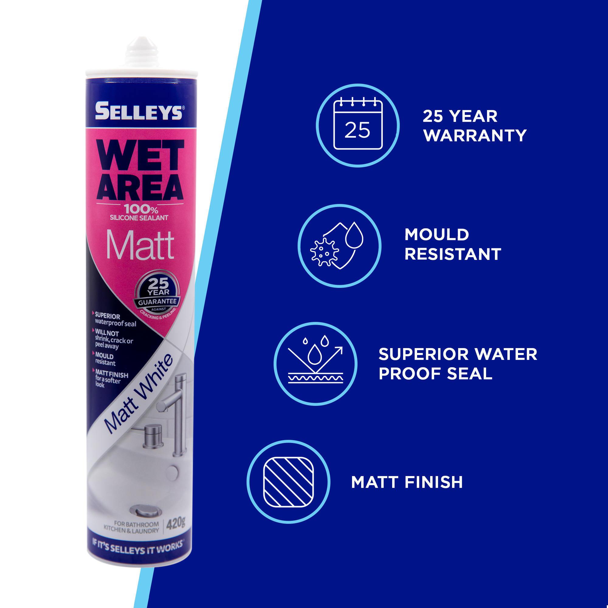 Selleys Wet Area is a 100% neutral cure, mould resistant silicone sealant, specially designed to create a long-lasting waterproof seal that will not shrink, crack, or peel away.